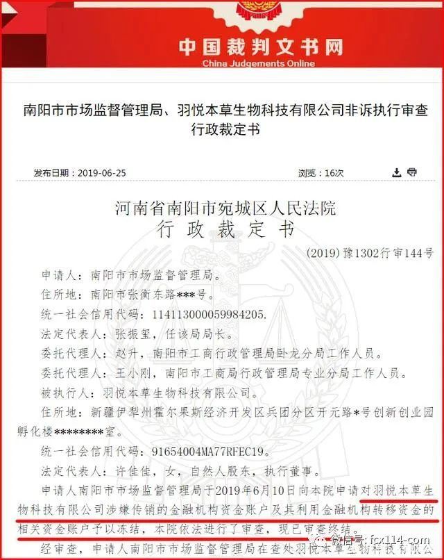 由河南省南阳市市场监督管理局于2019年6月10日向南阳市宛城区人民法院申请对羽悦本草生物科技有限公司(以下简称:羽悦本草生物)涉嫌传销的金融机构资金账户及其利用金融机构转移资金的相关资金账户予以冻结,本院依法进行了审查,现已审查终结。 |