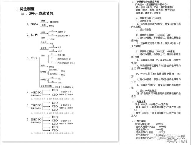 奖金制度截图 融媒新发现注意到,康视雅公司模式分为直推奖、管理奖、平级奖、分红奖、团队积分奖、区域收租奖,只要投资399元就可以获得以上奖励,此外还有几种投资给到你选择。 1.合伙人:399元认购一套产品; 2.总代条件:1、直推五套产品,2、团队累计销售满50套产品; 3. CEO条件:1直推5套,2团队累计满500套,3自己向下直推的两组市场各销售满50套以上; 4.一星CEO条件:下面直推会员中两个完成CEO身份; 5.二星CEO条件:下面直推会员中三个完成CEO身份; 6.三星CEO条件:下面直推会员中5个完成CEO身份; 7.家庭店、总代身份(投资15960元); 8.店中店总代身份(投资29000元); 9.旗舰店CEO身份(投资135000元)。 在认购商品成为会员后,康视雅公司推出的奖金制度名目繁多,以旗舰店CEO为例,旗舰店CEO身份(投资135000元):一、护眼仪器10台,二、护眼液300套,送97700元面膜赠品,送一个城市代理,(未来只要有公司产品进入你区域永久享受3元套)区域收租奖。例:直推每天卖两套产品,每套利润200元,400元天,月收益12000元。按直推20人算,每人天卖一套,每天是20套产品,管理奖的合伙人部分:80元套,1600元天,月收益48000元,合计:64000元月收益。 据相关律师表示:康视雅公司通过发展人员,要求被发展人员交纳费用或者以认购商品等方式变相交纳费用,取得加入或者发展其他人员加入的资格,要求被发展人员发展其他人加入,形成上下线关系,并以下线的销售业绩为依据计算和给付上线报酬,这无疑已涉嫌传销。 而公开信息显示,广州康视雅量子科技有限公司成立于2020年7月27日,法人代表刘飞;注册资本100万,经营范围:企业管理服务;降科学项目研究、开发;医学研究和试验发展等等。此外,汉方视康是汉方集团旗下的品牌,集团于1999年在香港成立,旗下拥有广州汉方禅修堂文化公司、广州汉方化妆品制造有限公司、广州汉方视康量子科技有限公司等九家公司。2019年4月10日,汉方视康商标注册成功,同年的4月22日,广州汉方视康量子科技有限公司登记成立,法定代表人龙世闻,公司股东为龙世闻和乔加军,注册资本100万元。目前汉方集团与广州白云山潘高寿药业股份有限公司一起合作打造汉方视康量子商城,广州汉方视康量子科技有限公司是汉方视康的特约经销商,汉方视康的生产商为广州汉方药业有限公司。 对此,融媒新发现将持续关注! 文章来源:融媒新发现 |