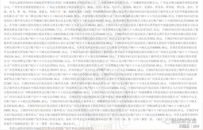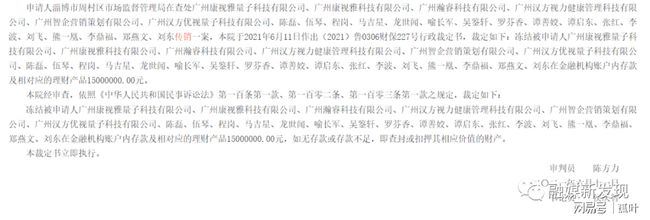 0分享至![]() 截图来自:中国裁判文书网 防骗网讯:近日,中国裁判文书网公布一则题为淄博市周村区市场监督管理局、广州康视雅量子科技有限公司执行实施类执行裁定书(2021)鲁0306执保318号显示,申请人淄博市周村区市场监督管理局在查处广州康视雅量子科技有限公司、广州康视雅科技有限公司、广州瀚睿科技有限公司、广州汉方视力降管理科技有限公司、广州智企营销策划有限公司、广州汉方优视量子科技有限公司、陈磊、伍琴、程岗、马吉星、龙世闻、喻长军、吴鉴轩、罗芬香、谭善姣、谭启东、张红、李波、刘飞、熊一凰、李鼎福、郑燕文、刘东传销一案,本院于2021年6月11日作出(2021)鲁0306财保227号行政裁定书,裁定如下:冻结被申请人广州康视雅量子科技有限公司、广州康视雅科技有限公司、广州瀚睿科技有限公司、广州汉方视力降管理科技有限公司、广州智企营销策划有限公司、广州汉方优视量子科技有限公司、陈磊、伍琴、程岗、马吉星、龙世闻、喻长军、吴鉴轩、罗芬香、谭善姣、谭启东、张红、李波、刘飞、熊一凰、李鼎福、郑燕文、刘东在金融机构账户内存款及相对应的理财产品15000000.00元。 ![]() 截图来自:中国裁判文书网 本院经审查,依照中华人民共和国民事诉讼法第一百条第一款、第一百零二条、第一百零三条第一款之规定,裁定如下: 冻结被申请人广州康视雅量子科技有限公司、广州康视雅科技有限公司、广州瀚睿科技有限公司、广州汉方视力降管理科技有限公司、广州智企营销策划有限公司、广州汉方优视量子科技有限公司、陈磊、伍琴、程岗、马吉星、龙世闻、喻长军、吴鉴轩、罗芬香、谭善姣、谭启东、张红、李波、刘飞、熊一凰、李鼎福、郑燕文、刘东在金融机构账户内存款及相对应的理财产品15000000.00元,如无存款或存款不足,即查封或扣押其相应价值的财产。 本裁定书立即执行。 ![]() ![]() 截图来自:中国裁判文书网 此外,值得注意的是,中国裁判文书网还发布一则题为淄博市周村区市场监督管理局、广州康视雅量子科技有限公司执行实施类执行裁定书(2021)鲁0306执保318号之一显示,申请人淄博市周村区市场监督管理局在查处广州康视雅量子科技有限公司、广州康视雅科技有限公司、广州瀚睿科技有限公司、广州汉方视力降管理科技有限公司、广州智企营销策划有限公司、广州汉方优视量子科技有限公司、陈磊、伍琴、程岗、马吉星、龙世闻、喻长军、吴鉴轩、罗芬香、谭善姣、谭启东、张红、李波、刘飞、熊一凰、李鼎福、郑燕文、刘东传销一案,根据生效的(2021)鲁0306执保318号执行裁定书于2021年6月12日依法冻结了被申请人刘飞在中国建设银行股份有限公司广州广花三路支行账户62×××03人民币14638.20元、在招商银行股份有限公司广州分行机场路支行账户62×××73人民币986.57元。 于2021年6月12日依法冻结了被申请人张红在华融湘江银行湘西龙山县支行账户62×××97人民币501365.48元、在中国银行股份有限公司龙山支行账户60×××62CNY0人民币328043.95元、在中国工商银行股份有限公司珠海五洲支行账户20×××37人民币306445.19元,于2021年6月12日依法冻结了被申请人谭善姣在中国建设银行股份有限公司长沙解放东路支行账户62×××52人民币205081.77元、在中国农业银行股份有限公司广州美博城支行账户62×××19人民币75127.22元,于2021年6月12日依法冻结了被申请人龙世闻在中国建设银行股份有限公司湘潭湖湘支行账户62×××07人民币54649.21元,于2021年6月12日依法冻结了被申请人谭启东在中国农业银行股份有限公司广州白云支行账户62×××11人民币2005460.20元、在中国农业银行股份有限公司广州白云支行账户62×××10人民币5051.20元,于2021年6月12日依法冻结了被申请人陈磊在招商银行股份有限公司昆明分行金江支行账户62×××48人民币67219.98元。 于2021年6月12日依法冻结了被申请人程岗在中国农业银行股份有限公司重庆南岸弹子石支行账户62×××12人民币1075184.03元、在重庆农村商业银行南岸支行腾黄分理处账户06×××64人民币400000.00元、在重庆农村商业银行南岸支行腾黄分理处账户62×××36人民币302262.15元,于2021年6月12日依法冻结了被申请人罗芬香在中国建设银行股份有限公司广州瑞宝支行账户43×××74人民币62134.54元、在中国农业银行股份有限公司广州金碧支行账户62×××76人民币48344.28元,于2021年6月12日依法冻结了被申请人李波在中国工商银行股份有限公司广州站西路支行账户36×××21人民币823342.11元、在中国农业银行股份有限公司广州白云支行账户62×××74人民币539230.07元、在中国农业银行股份有限公司广州黄石支行账户62×××17人民币8511.21元、在中国农业银行股份有限公司广州美博城支行账户62×××11人民币33745.08元、在中国农业银行股份有限公司广州美博城支行账户62×××19人民币67977.07元、在兴业银行广州天河北支行账户39×××27人民币408614.28元。 于2021年6月12日依法冻结了被申请人喻长军在中国建设银行股份有限公司广州斜路支行账户43×××68人民币39113.08元,于2021年6月12日依法冻结了被申请人郑燕文在中国农业银行股份有限公司汕头潮南胪岗支行账户62×××12人民币251530.16元,于2021年6月12日依法冻结了被申请人吴鉴轩在中国农业银行股份有限公司广州嘉禾支行账户62×××12人民币222497.73