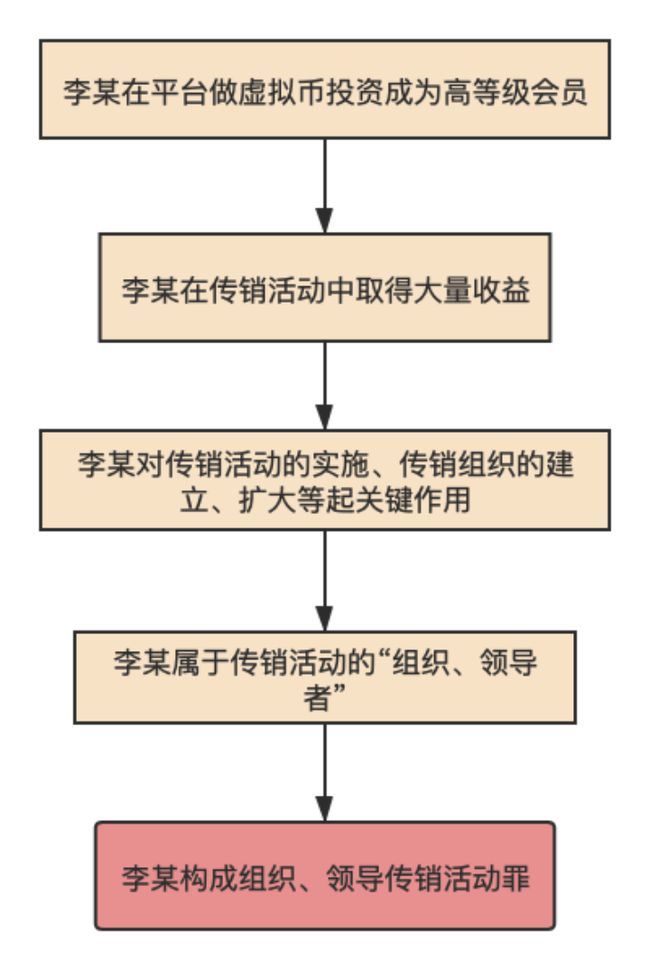 虚拟货币涉刑事犯罪研究系列(二十一): 在虚拟货币平台做投资,是否构成组织、领导传销活动罪? 作者: 杨天意律师,专注于新型经济犯罪、金融犯罪案件的辩护与研究,广东广强律师事务所经济犯罪辩护与研究中心秘书长。 李某是一名虚拟货币投资者,做比特币、以太坊等虚拟币投资已有三年多。20XX年的某一天,李某经朋友介绍得知有一个硅谷团队研发的名为W币的虚拟币上线。经李某考察,W币是基于以太坊技术开发,项目白皮书展示的应用前景及投资玩法都比较新颖,可以挖矿赚取收益,也可以投资RAM进行风险炒作,还有一些已经开发的DAPP可供使用。李某根据多年的投资经验,综合考察之后,认为W币这个项目目前价格处于低位,有很大的增长空间,是一个不错的投资机会,于是陆续投入了100多万。近半年的时间里,李某经过投资云矿机产生收益以及炒RAM等玩法,在平台赚取了近二十万个W币,李某随后又将赚取的W币进行了多轮复投。在这期间,由于李某投资较大,其在平台的等级由一般的青铜会员升级为白金会员,仅次于最高级的钻石会员。 W币平台会员的升级规则有两种,一种是平台个人投资,投资达到一定数额就可以升级;另一种是发展会员、向会员销售云矿机,达到一定的销售额就可以升级。李某属于第一种升级模式。等级高的会员获得的收益会更高,享有的权益也更多。 20XX年底,公安机关找到李某,以其涉嫌组织、领导传销活动罪依法刑事拘留。公安机关刑拘李某的原因是,李某参与投资的W币项目及虚拟币平台涉嫌传销犯罪,李某在平台内属于高等级会员,属于传销组织中的组织、领导者,因而涉嫌组织、领导传销活动罪。 李某在讯问中表示,其只是在平台内进行投资,投入的都是个人合法财产,其自始至终都没有发展过下线,也没有拿过一分因为发展下线获取的收益。 公安机关则认为,虽然李某没有发展下线,但其取得的巨额收益都是来源于传销活动中的传销参与人,且其因为参与传销活动成为层级较高的高等级会员,属于对传销活动的实施、传销组织的建立、扩大等起关键作用的人员,应认定为传销活动的组织、领导者。 以上案例中,李某的行为究竟能否认定为构成组织、领导传销活动罪,争议焦点在于:李某没有发展下线,在平台做虚拟币投资成为高等级会员,是否属于对传销活动的实施、传销组织的建立、扩大等起关键作用的人员,能否认定为组织、领导者? 如对以上争议焦点进行分解,实际上就是公安机关对李某的入罪逻辑: ![]() 笔者对以上案例中公安机关的入罪逻辑不能认同,理由如下: 第一,在没有发展下线的情况下,认定行为人构成传销不符合传销犯罪的客观要件。 根据最高人民法院、最高人民检察院、公安部关于办理组织领导传销活动刑事案件适用法律若干问题的意见(下称传销意见):以推销商品、提供服务等经营活动为名,要求参加者以缴纳费用或者购买商品、服务等方式获得加入资格,并按照一定顺序组成层级,直接或者间接以发展人员的数量作为计酬或者返利依据,引诱、胁迫参加者继续发展他人参加,骗取财物,扰乱经济社会秩序的传销组织,其组织内部参与传销活动人员在三十人以上且层级在三级以上的,应当对组织者、领导者追究刑事责任。 传销意见明确规定了构成传销犯罪的客观要件,简而言之,就是收取入门费、拉人头、层级返利。实施了以上行为,并且人数在三十人以上且层级在三级以上的,构成传销。 入门费、拉人头、层级返利可以说是传销的可视化标签,更是传销最基本的行为模式及构成要件。如果没有这些要件,能否认定为传销? 答案是,不能。传销犯罪的危害在于,行为人通过人传人、人拉人的方式,使得某种虚假的商品或服务在社会上快速传播,既扰乱了市场秩序,又侵犯了公民的私有财产。国家打击传销及传销犯罪,本质上就是打击这种扰乱市场秩序、骗取财物的推广模式。因此,没有入门费、拉人头、层级返利的传销犯罪,实际上就是没有传销的犯罪,这已经脱离了传销犯罪的本质。案例中公安机关对李某行为的评价就是陷入了这样的认知错误。 第二,适用兜底条款肆意认定行为人系对传销活动的实施、传销组织的建立、扩大等起关键作用的人员,扩大了传销犯罪的打击范围。 组织、领导传销活动罪打击的对象是传销活动的组织者、领导者。传销意见认定的组织者、领导者包括五类:(一)在传销活动中起发起、策划、操纵作用的人员;(二)在传销活动中承担管理、协调等职责的人员;(三)在传销活动中承担宣传、培训等职责的人员;(四)曾因组织、领导传销活动受过刑事处罚,或者一年以内因组织、领导传销活动受过行政处罚,又直接或者间接发展参与传销活动人员在十五人以上且层级在三级以上的人员;(五)其他对传销活动的实施、传销组织的建立、扩大等起关键作用的人员。 对于李某的行为,显然不属于前四类,但究竟能否认定为第(五)类其他对传销活动的实施、传销组织的建立、扩大等起关键作用的人员? 笔者认为,不能。根据最高人民检察院政策研究室关于传销案件的法律适用:七条规定明确六方面问题一文的论述:其他对传销活动的实施、传销组织的建立、扩大等起关键作用的人员,如在传销组织中承担资金结算、财务管理等其他重要职责,对传销活动实施起关键作用的人员。 最高人民检察院政策研究室