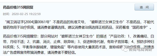 而往前追溯到2020年,在药品价格315网上,也有关于这款产品的争议发生,当时,有网友晒出了这款产品的相关信息试图求证这款产品的功效:碧斯诺兰女神卫生巾的卫生许可号为闽卫消证字[2004]第0061号,授权生产商为福清市益兴堂卫生制品有限公司。 对此,药品价格315网回复:部分网站对碧斯诺兰女神卫生巾的描述产品功效:1、改善痛经、白带、月经不适;2、抗菌、消炎、止痒、除异味;3、促进新陈代谢,有助子宫排毒;4、预防多种妇科疾病;5、平衡身体酸碱度,增强免疫等内容使用大量医药术语,宣称或暗示治疗疾病,涉嫌违法广告虚假宣传欺骗消费者,请消费者不要轻信。