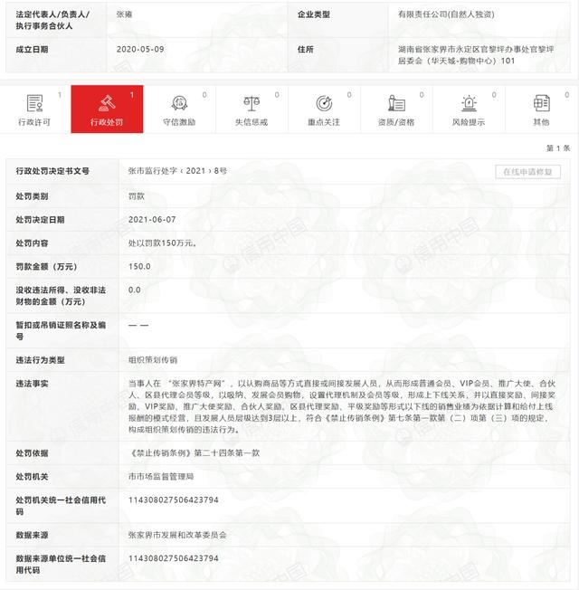 不久前,北青网降从信用中国获悉,张家界张氏农业发展有限公司因组织策划传销被张家界市场监督管理局处罚150万元。 据行政处罚决定书(张市监行处字﹝2021﹞8号) 显示,当事人在 张家界特产网,以认购商品等方式直接或间接发展人员,从而形成普通会员、VIP会员、推广大使、合伙人、区县代理会员等级,以吸纳、发展会员购物,设置代理机制及会员等级,形成上下线关系,并以直接奖励、间接奖励、VIP奖励、推广大使奖励、合伙人奖励、区县代理奖励、平级奖励等形式以下线的销售业绩为依据计算和给付上线报酬的模式经营,且发展人员层级达到3层以上,符合禁止传销条例第七条第一款第(二)项第(三)项的规定,构成组织策划传销的违法行为。 据悉,张家界特产网是一个由张家界市电商运营服务中心有限公司主办的主要是通过线上渠道销售张家界农产品、张家界特产的一个网站并采用采用互联网+三农经营模式,打造集张家界市农产品展示展销、线上销售、仓储物流配送于一体的市级电子商务运营服务平台。