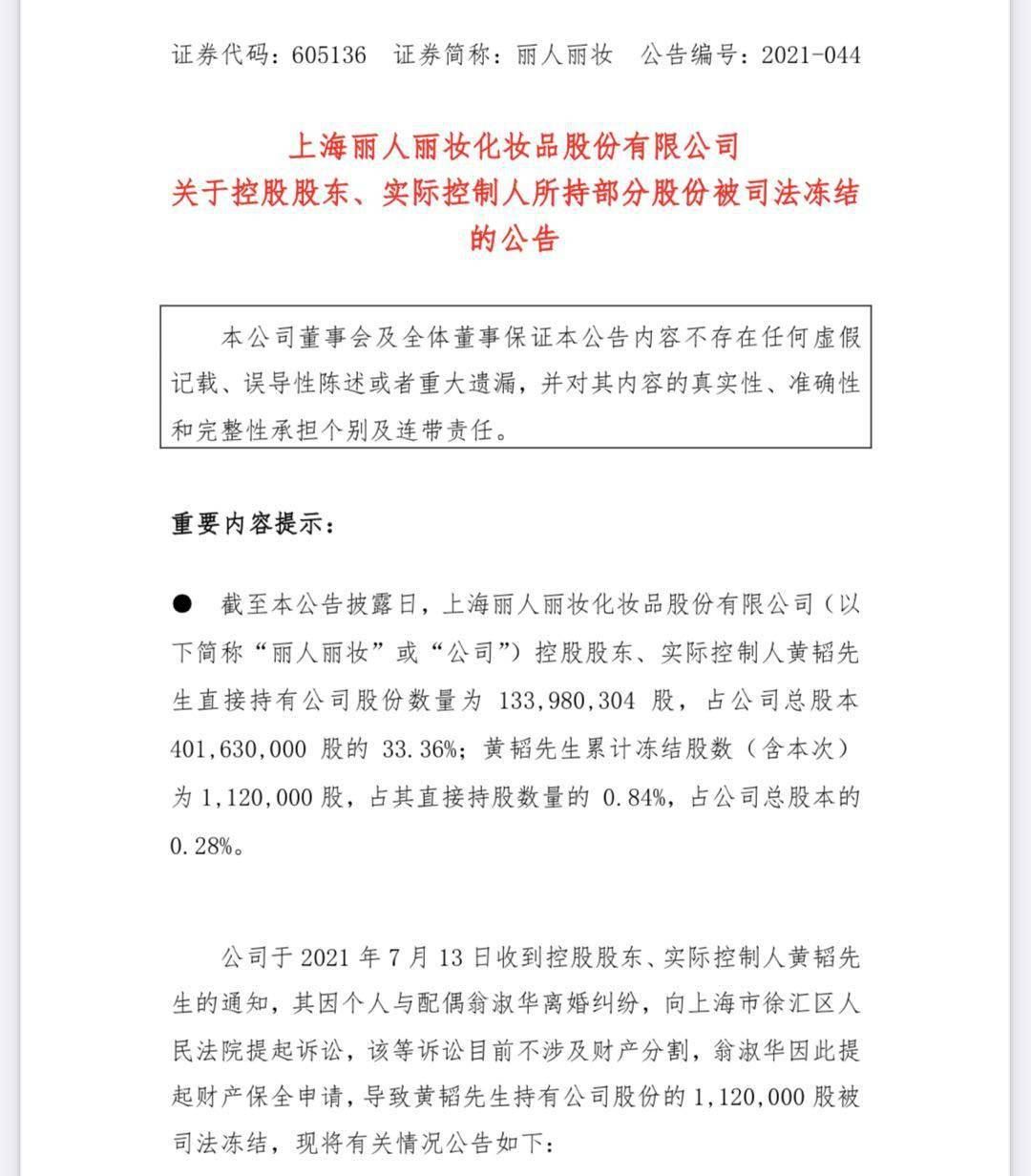 丽人丽妆表示,公司于2021年7月13日收到控股股东、实际控制人黄韬通知,其因个人与配偶翁淑华离婚纠纷,向上海市徐汇区人 民法院提起诉讼,该等诉讼目前不涉及财产分割,翁淑华因此提起财产保全申请,导致黄韬持有公司股份的1,120,000股被司法冻结。 丽人丽妆指出,黄韬所持有的公司股份被司法冻结,对公司的生产经营无重大影响,目前也不会对公司的控制权产生影响。鉴于相关案件尚未开庭审理,后续对公司的影响具有不确定性,公司 董事会将积极关注上述事项的进展,并督促相关股东按照相关法律法规要求及时履行信息披露义务。 |