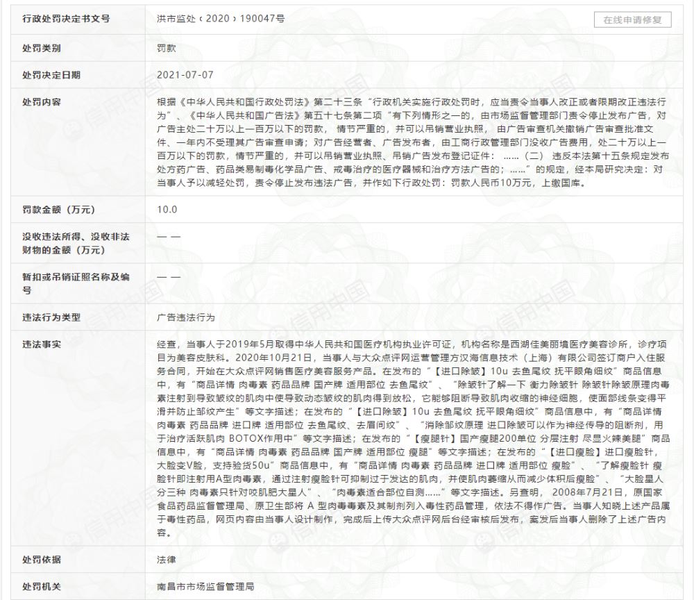 据悉,该处罚决定文书为洪市监处﹝2020﹞190047号,处罚日期为2021年7月7日。经调查后违法事实如下: 当事人于2019年5月取得中华人民共和国医疗机构执业许可证,机构名称是西湖佳美丽境医疗美容诊所,诊疗项目为美容皮肤科。2020年10月21日,当事人与大众点评网运营管理方汉海信息技术(上海)有限公司签订商户入务合同,开始在大众点评网销售医疗美容服务产品。 当事人在发布的进口除皱10u 去鱼尾纹 抚平眼角细纹商品信息中,有商品详情 肉毒素 药品品牌 国产牌 适用部位 去鱼尾纹、除皱针了解一下 衡力除皱针 除皱针除皱原理肉毒素注射到导致皱纹的肌肉中使导致动态皱纹的肌肉得到放松,它能够阻断导致肌肉收缩的神经细胞,使面部线条变得平滑并防止邹纹产生等文字描述;在发布的进口除皱10u 去鱼尾纹 抚平眼角细纹商品信息中,有商品详情 肉毒素 药品品牌 进口牌 适用部位 去鱼尾纹、去眉间纹、消除邹纹原理 进口除皱可以作为神经传导的阻断剂,用于治疗活跃肌肉 BOTOX作用中等文字描述;在发布的瘦腿针国产瘦腿200单位 分层注射 尽显火辣美腿商品信息中,有商品详情 肉毒素 药品品牌 国产牌 适用部位 瘦腿等文字描述;在发布的进口瘦脸进口瘦脸针,大脸变V脸,支持验货50u商品信息中,有商品详情 肉毒素 药品品牌 进口牌 适用部位 瘦脸、了解瘦脸针 瘦脸针即注射用A型肉毒素,通过注射瘦脸针可抑制过于发达的肌肉,并使肌肉萎缩从而减少体积后瘦脸、大脸星人分三种 肉毒素只针对咬际大星人、肉毒素适合部位自测……等文字描述。 另查明, 2008年7月21日,原国家食品药品监督管理局、原卫生部将 A 型肉毒毒素及其制剂列入毒性药品管理,依法不得作广告。当事人知晓上述产品属于毒性药品,网页内容由当事人设计制作,完成后上传大众点评网后台经审核后发布,案发后当事人删除了上述广告内容。 根据中华人民共和国行政处罚法第二十三条及中华人民共和国广告法第五十七条第二项规定,经南昌市市场监督管理局研究决定:对当事人责令停止发布违法广告,并罚款人民币10万元,上缴国库。