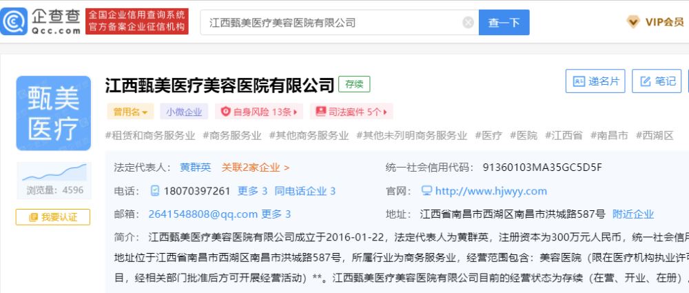 该公司显示的经营范围包含:美容医院(限在医疗机构执业许可证许可范围内经营)。事实上,这并非是该公司第一次因广告违法行为而遭到处罚,舆情观察网注意到,早在2018年4月,甄美医疗美容医院被南昌市西湖区市场监督管理局处罚人民币2万元,上缴国库。