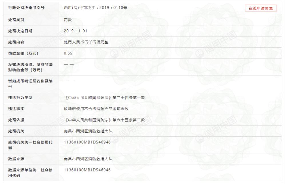 此外,该公司在2019年11月因使用不合格消防产品逾期未改受到行政处罚,根据中华人民共和国消防法第六十五条第二款规定,被南昌市西湖区消防救援大队予以罚款5500元。 舆情观察网将继续予以关注。 |