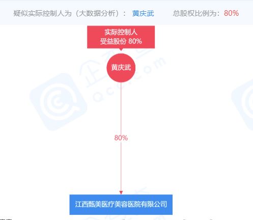 企查查显示,江西甄美医疗美容医院有限公司注册于2016年1月,注册资金300万元,实缴资本60万。法定代表人为黄群英,公司职务为总经理及执行董事。该公司大股东和实际控制人为黄庆武,持股比例为80%。