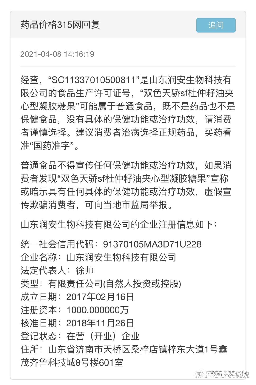 同时,我们发现,在药品价格315网上也有消费者对该款产品进行了咨询,对此,得到的回复是:双色天骄sf杜仲籽油夹心型凝胶糖果既不是药品也不是保健食品,没有具体的保健功能或治疗功效,若发现产品宣称或暗示具有任何具体的保健功能或治疗功效,虚假宣传欺骗消费者,可向当地市监局举报。