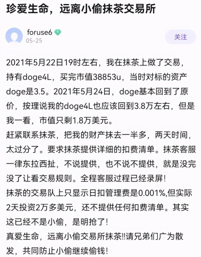 那么近期传出的抹茶偷建老鼠仓又是怎么回事呢? 据多位用户联合匿名称,发现自己的资产被无缘无故修改,抹茶官方交流群直接炸锅。 用户爆料:两天时间,扣了将近一半的钱,却连个扣费清单都舍不得提供,完全没有道理。 或许抹茶不是舍不得提供扣费清单,而是根本就没有,摆明了就是胡乱扣钱,哪里拿得出扣费单呢?这不是小偷,这是明抢! 事实上,类似这种情况在抹茶交易所也不是头一次发生。 还有一名用户,也是在抹茶上进行交易,买了40000多个FST,等到涨到一个10U的时候,结果币种被下架了,买入的FST变成了所谓的FST1,资产也就剩一个币。 辛辛苦苦交易了半天,结果不仅币种变了,就连资产总量也变少了,简直就是笑话。