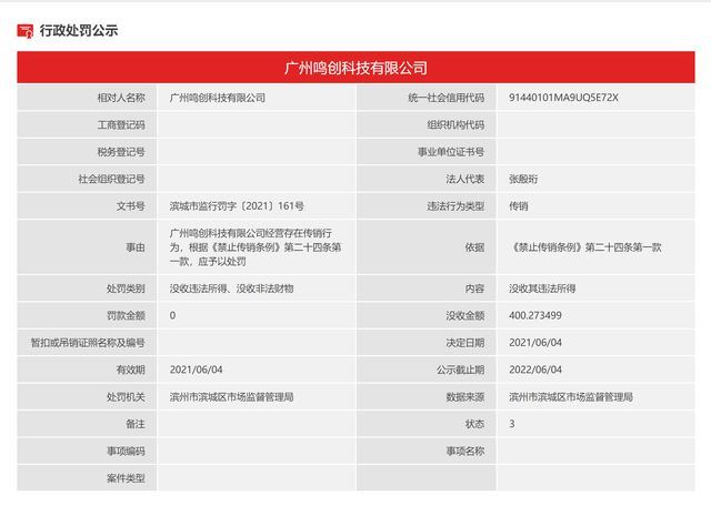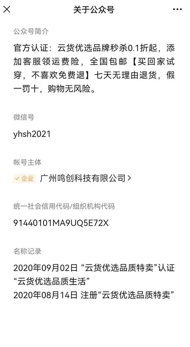 近日,信用滨州公示了一起行政处罚信息,广州鸣创科技有限公司经营存在传销行为,违反了禁止传销条例第二十四条第一款规定,依据禁止传销条例第二十四条第一款,滨州市滨城区市场监督管理局予以处罚,没收违法所得、没收非法财物,没收金额400.273499万元。 ![]() 值得注意的是,此次广州鸣创科技有限公司(以下简称:广州鸣创公司)被罚,或与云货优选社交电商平台有关。 企查查显示,广州鸣创公司成立于2020年8月3日,法定代表人为张殷珩,注册资本100万元人民币,在知识产权公示栏中,该公司两则相关的微信公众号备案就是云货优选品质生活。 ![]() 据悉,云货优选商标注册的公司为广州微革网络科技有限公司(以下简称:广州微革公司)。 根据百度百科介绍,云货优选是广州微革网络科技有限公司自主研发的品牌特卖小程序,于2018年5月正式上线,主要业务为服饰、鞋帽、箱包、家纺、美妆和生活日用品的库存特卖。对于该平台,公众号云货优选店主招募站的说法更加完善,云货优选是全国TOP10的社交电商平台,参投资本有小米基金,泽厚资本,维嘉资本,坤万创投,华颖基金,天使汇等,在品牌服装特卖领域有着绝对优势。 相关资料显示,2018年5月,云货优选小程序正式上线,开始招募第一批种子用户;6月,平台推出社交裂变体系1.0,店主成长体系雏形就此出现;12月,平台联合专业法务,将社交裂变体系1.0升级至2.0;2019年4月,平台上线自动售后系统;2020年2月,平台启动实体行业帮扶计划。创办至今,经过两年多的发展,云货优选月销售额已达到了数亿。去年,云货优选还被知名媒体评选为2019年中国互联网最具投资价值Top50公司。 值得一提的是,2020年10月26日,中新融媒、反传联盟等多家媒体发表文章,披露广州微革网络科技有限公司、云货优选因涉嫌传销,湖南相关执法部门已经介入调查。文章通过云货优选拉人头、发展下线、奖金制度及受害者投诉等事实,介绍了云货优选因涉嫌传销,湖南的市场监督管理执法部门已经介入调查的经过。