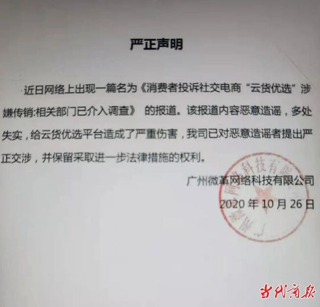 在此情况下,云货优选在自己的平台发表严正声明,希望其会员莫被虚假信息扰乱判断。而后,10月27日至29日,广州微革网络科技有限公司通过广东知明律师事务所分别向中新融媒等多家自媒体就云货优选涉嫌传销,相关执法部门已介入调查这篇文章发出律师函,并以网络侵权(名誉权纠纷)向广州互联网法院提起诉讼。数天后,微革网络公司对此案主动提出撤诉。 |