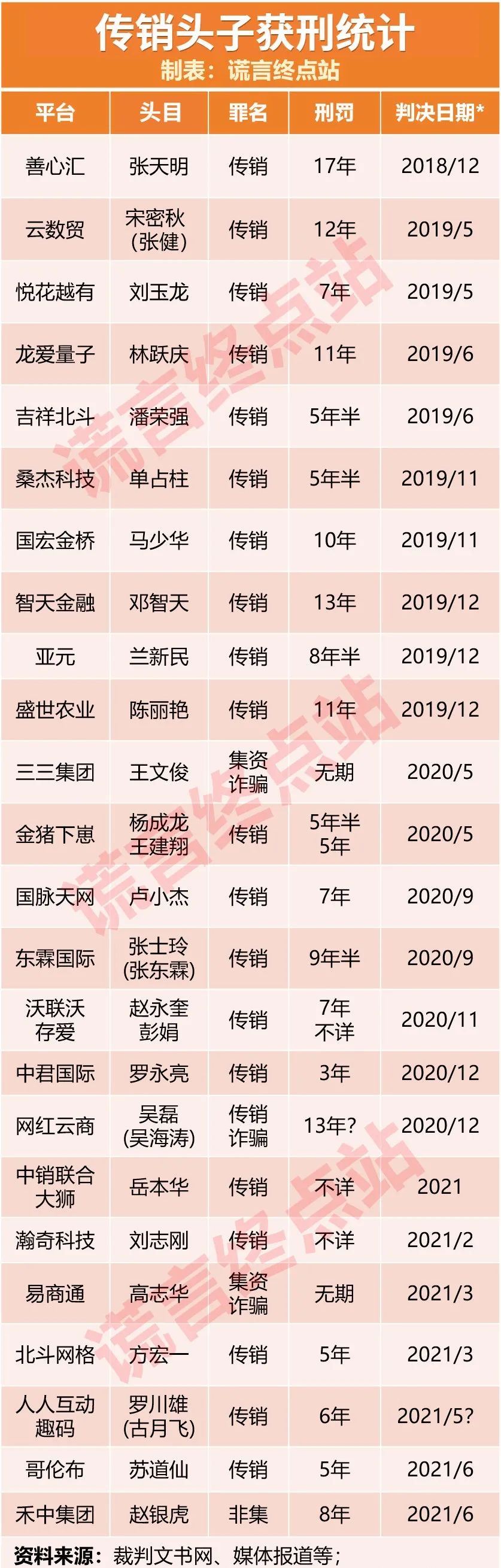 有人问:这是真的吗?当然是假的!是为了忽悠下线诈骗钱财编造的谎言! 今天,我们就对上述名单进行初步的调查和统计,看看这些传销头子究竟如何获刑? 部分人员信息不详,有的在押但尚未审理或信息尚未公开,因此,未统计入内。需要指出的是,在那张编造的名单中个别人员(如张文中、顾雏军等),与传销毫无关系,且早已释放,这是漏网之鱼有意编造混淆,以误导视听。 其中判决日期指一审时间,不详指已确认判刑但刑期不详,?表示未确定,尚未获得权威来源证实。