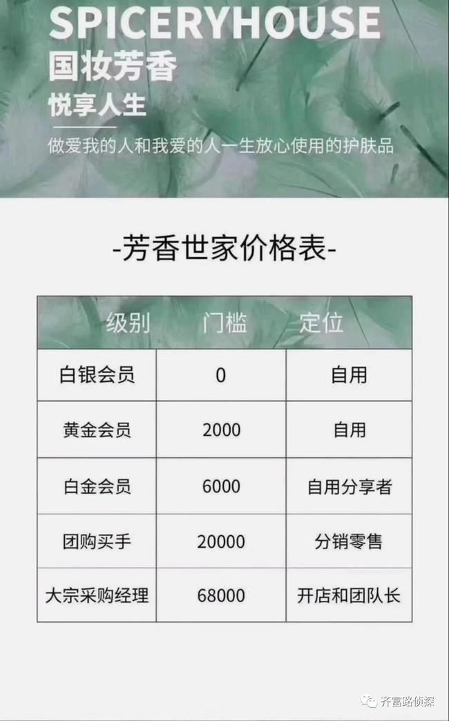 一入传销深似海绝对不是一句玩笑话。有多人沾上了传销,从此就走上了不归路。为什么说脱离传销那么难?当你了解了传销的模式后,就不太会痛恨,反而会感叹,擦亮眼睛,传销这个东西,连沾都不能沾。一旦沾上身,摆脱太难了! ![]() 不单单是南派北派,传销的模式被运用到多个行业,微商更是重灾区。据了解,国妆集团芳香世家采用高达六级的代理模式,在高昂的返利的刺激下,吸引了一大批的人加入。在成为代理后,芳香世家便拥有一套独特的代理模式,将代理牢牢捆住。 据悉,国妆芳香世家共有六个代理级别,分别为白银会员、黄金会员、白金会员、团购买手、大宗采购经理和公司销售经理,对应的首次购买费用(门槛费)分别是0元、2000元、6000元、2万元、6.8万元,以及25万元。除门槛费不同外,每个级别的代理进货价格也都不同。 ![]() 据国妆芳香世家代理爆料,前三个月没有考核业绩,三个月后,2万元的(代理)每个月要补货5000 ,6.8万的10000,25万的每个月要向公司拿3万的货,不然就会被降级。降级则意味着不能再按照原先加入的级别价格进货。 而且国妆芳香世家的货不能存放在公司,一个月必须全部拖回家,就算卖不完很多代理退都没法退,货都在自己家呢。一套护肤品使用周期几个月,卖不完货只能砸在自己手里。 多位国妆芳香世家代理反应称芳香世家主要不是靠卖产品赚钱,而是通过拉人头赚钱,25万主要拉6.8万,6.8万拉2万,2万只能自用或者零售2000的6000的,在好好的培养这些个代理升级,再去拉人,都是通过身边的亲戚朋友开始,各种推销。