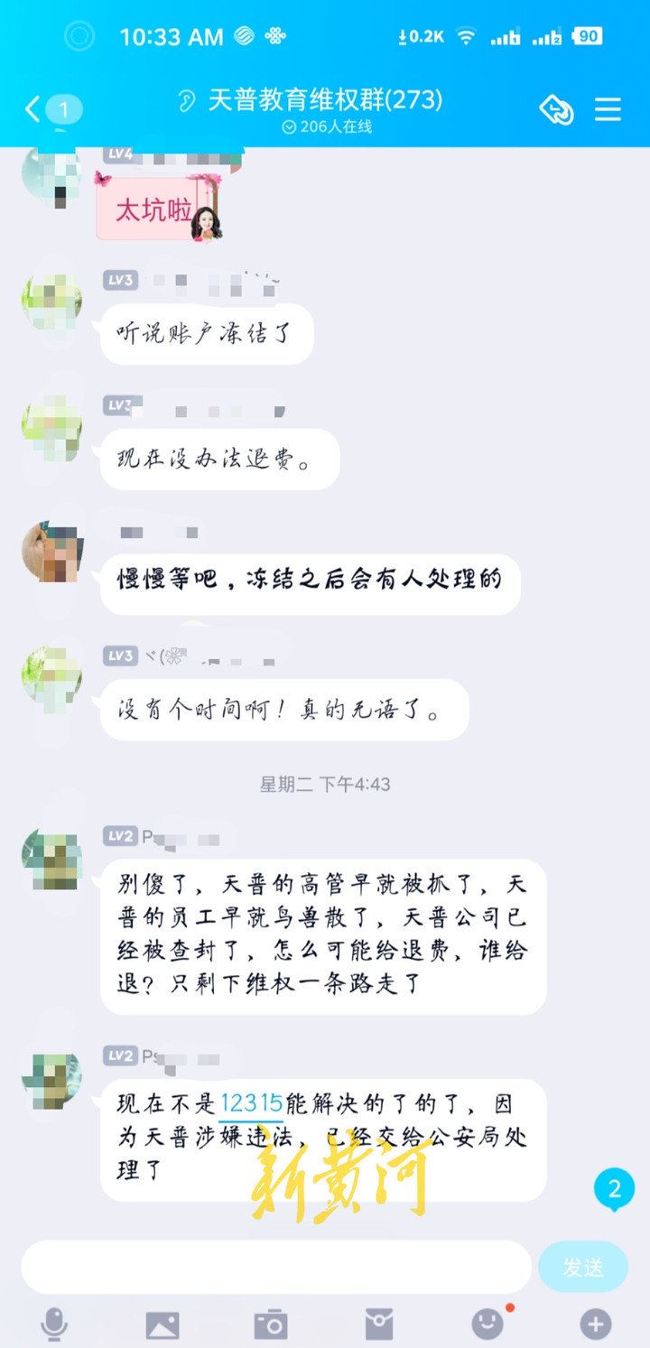 新黄河记者加入天普教育维权群天普教育投诉交流群等多个QQ群发现,每个群均有两三百人,基本都是报考了消防工程师、BIM工程师、装配式工程师、智能建造师等,大家均反映天普教育失联学费被骗等情况,每人被骗少则万元,多则四五万元。现在天普教育工作人员都联系不上了,网络课程停了,考试也没法考,学费找不到地方退。我们有十几个维权群,群里初步统计了一下,受骗学员遍布全国20多个省市,人数至少上万人。众多学员向记者反馈。6月25日,北京12345曾回复学员反馈称:经核实,北京天谱同盛教育科技有限公司因涉嫌违法,其办公经营场所已无经营办公,公司相关工作人员已被江苏警方控制。相关消费退费纠纷建议通过司法途径解决。