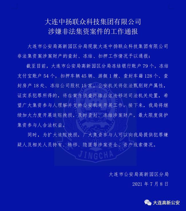 大连中扬联众科技集团有限公司涉嫌非法集资案件的工作通报 文章来源:大连高新公安 大连中扬联众科技集团有限公司涉嫌非法集资案件的工作通报 大连市公安局高新园区分局现就大连中扬联众科技集团有限公司非法集资案涉案财产的查封、冻结、扣押工作情况予以通报: 截至目前,大连市公安局高新园区分局冻结银行账户79个,冻结支付宝账户54个,扣押车辆45辆、游艇1艘、查封车籍128个、查封房产18处、冻结公司股权15家。公安机关将依法甄别财产属性,证实系犯罪所得的,将在案件侦查终结后依法移送司法机关处置,希望广大集资参与人理解并支持公安机关开展工作。接下来,我局将继续加大力度开展追赃挽损,及时查封、冻结涉案财产,最大限度保护集资参与人合法权益。 同时,为扩大追赃挽损,广大集资参与人可以向我局提供犯罪嫌疑人及相关人员持有、转移、隐匿等涉案资金、资产线索情况。