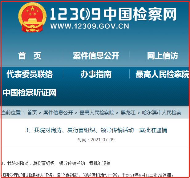 7月9日,黑龙江省哈尔滨市南岗区人民检察院于2021年6月11日,对陶某、夏某喜组织、领导传销活动一案批准逮捕。