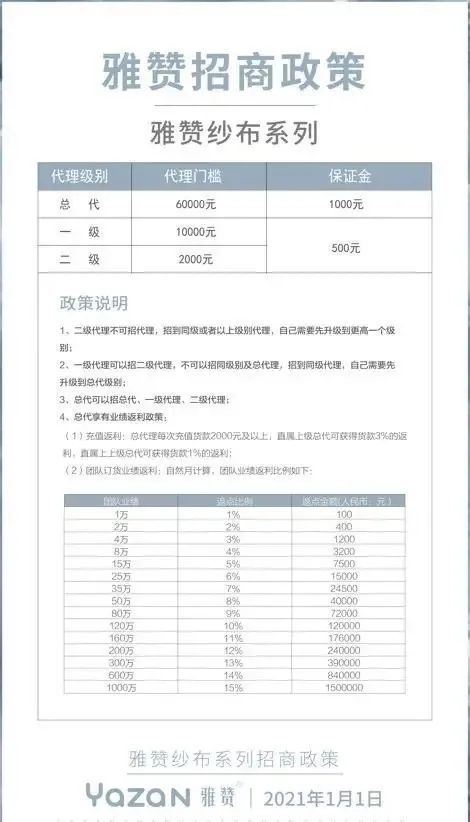 雅赞被指涉嫌虚假宣传,母婴品牌产品也不安全了吗? 近日,有消费者投诉在天猫雅赞母婴旗舰店购买的新疆长绒棉纱布软凉席产品效果远不及其宣传效果,涉嫌虚假宣传营销。 据悉,上述产品宣称适合新出生的宝宝、坐月子的宝妈及关节不好的老年人和易出汗人群使用,可有效预防关节炎、空调病等富贵病。但是该消费者认为在使用该产品后根本没有效果。 公开资料显示,雅赞主营研发、生产、销售母婴类棉纱和婴幼儿纸尿裤及家居类产品,产品主要分为雅赞棉纱和雅赞纸尿裤两个系列。 对于涉嫌虚假宣传的投诉,雅赞向GPLP犀牛财经表示其不存在虚假宣传,已通知经销商进行自查,并且加强经销商相关方面法规的普及和学习。 营销模式类似传销 实际上,雅赞在陷入涉嫌虚假宣传的舆论之外,还被指营销模式涉嫌传销,这又是怎么一回事呢? GPLP犀牛财经注意到,雅赞是按照两个产品系列进行代理招商,分为不同层次进行代理。 其中雅赞纱布系列代理主要分为三级,分别是总代、一级、二级,代理门槛分别为6万元、1万元、2千元,而总代需要缴纳保证金1千元,一级和二级代理需要缴纳500元保证金。
