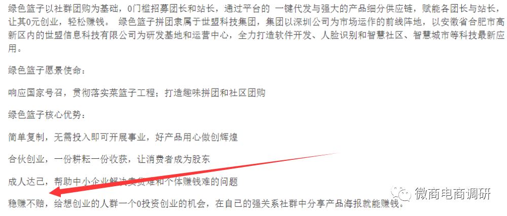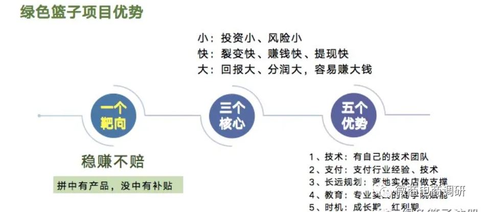 后 记 近期,网络商城或平台上出现了一种新的返利营销模式,这个模式就是拼团返利。由于拼团成功可享购物优惠、拼团不成功则可以获得一定比例返利,吸引了不少消费者参与其中。监管部门现已指出,拼团返利模式具有以下风险:一是涉嫌非法集资;二是涉嫌售卖假冒伪劣产品;三是卷钱跑路。多地的打击和处置非法集资工作领导小组办公室已经对此发出提醒:切莫贪图小利,此模式可能衍生非法集资行为,提醒广大消费者小心被收割。一旦发现,请及时向当地公安局、银保监管组、市监局等部门举报或者报案。 现如今,借着当下疫情蔓延的背景,绿色篮子已把目标人群锁定在了那些生活费还不够的大学生的身上。