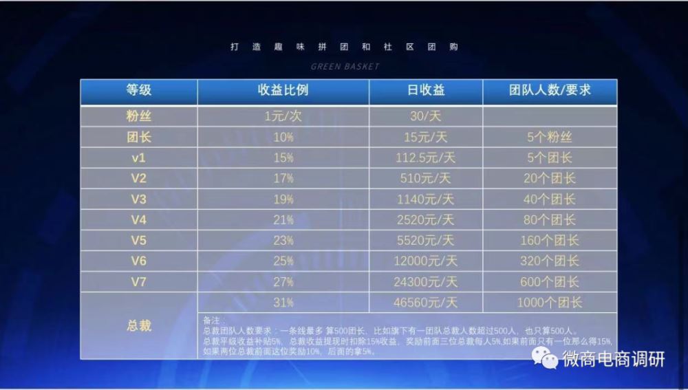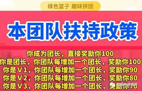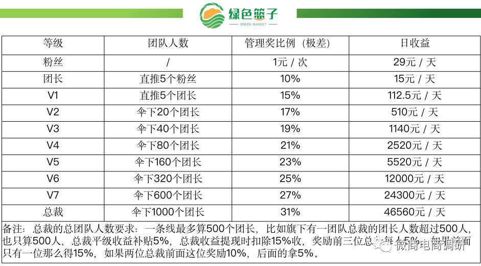 反传销网8月31日发布:在上篇报道中,我们了解到了站在绿色篮子背后的世盟科技集团是否真的是一家集团公司,关联企业各自存在哪些问题,在本篇报道中,我们将着重关注的是绿色篮子现行制度有何特色,平台官方出台了哪些通知。 揭底制度,十个级别 说到绿色篮子现行的奖金制度,推广人员阿力(化名)提供了如下资料: 第一,绿色篮子拼团规则介绍: 1. 每个账号每天可参与拼团30次。 2. 报名参团之后将自动进行拼团,无需手动操作,一轮拼团结束自动结束(一轮是拼中5次中奖)。 3. 报名参团要求:点击购买拼团专区的产品,可以选择100元,200元,500元均可自动报名参团,区别在于,你购买100元产品,在拼团自动开始参与拼团时中奖了1次,那么系统将自动停止拼团,如果你购买500元产品,在拼团自动开始参与拼团时中奖了1次,你还有4个产品没有参与拼团,那么系统将会继续参与接下来的拼团,确保收益最大化。 4. 报名参团时间:上午7:00-22:00,过22:00,将报名次日拼团。 5. 每次参团未中奖补贴广告费1元/次。 6. 每次参团中奖获得一件产品,在我的-百宝箱-库存中会有一件产品;累计拼中5次,可以选择4件寄售(随时可以提现),其中1件商品发货到家。 7. 100人参团其中有3人中奖,97人未中奖,中奖的3人。 8. 当你拼中5件产品时,参加拼团的次数在150次,也就是收益150元,时间5天,每天拼30次。 9. 产品寄售出去你将获得产品等值的现金,产品单价100元,那么你寄售出4件产品,你就可以获得400元,你可以重新用这400元购买产品参加拼团的报名,继续拼团。 10. 当循环拼团的400元都中奖时,那么你再次参与拼团120次左右,也就是再次收益120元,时间4天,此时你可以用之前的收益的150+120=270元的收益,拿出100元再次购买产品,报名参与拼团,这样拼中5次产品,又可以用同样的方式重新参与拼团,一直循环。 第二,绿色篮子静态收益介绍: 按照平台概率算100人中奖3人,97人不中奖,中奖率3%的情况:每天可以拼30次,用购买500元产品举例:(拼团中奖5次为一轮)一个账号每天拼30次,一天可以获得30元拼团奖励,按照中奖概率,一个月一个账号可以拼900次,中奖27次,一轮拼团是5次,也就是5轮,900-27=873次,也就是873元,扣除本金500元,实际月收益373元/月,额外加上5或6件(价格100元的产品)。 30天都拼不中的情况:每天可以拼30次,用购买100元产品举例:一个账号每天拼30次,一天可以获得30元拼团奖励,在拼不中的情况连续拼30天,静态收益30天*30次=900元/月,扣除你本金的100元,实际月收益800元/月。 第三,绿色篮子拼团玩法(动态收益): V1 邀请5个粉丝参与拼团(赚团队5%提成), 收益:每日拼团30次*5个粉丝=150次(元) 150元*5%=7.5元 5个团长当日总收益: 7.5元*5个团长=37.5元 V2 邀请25个团长参与拼团(赚团队6%提成), 1个团长收益:拼团30次*5个粉丝=150次(元) 150元*6%=9元 25个团长当日总收益: 9元*25个团长=225元 V3 邀请50个团长参与拼团(赚团队7%提成), 1个团长收益:拼团30次*5个粉丝=150次(元) 150元*7%=10.5元 50个团长当日总收益: 10.5元*50个团长=525元 V4 邀请100个团长参与拼团(赚团队8%提成), 1个团长收益:拼团30次*5个粉丝=150次(元) 150元*8%=12元 100个团长当日总收益: 12元*100个团长=1200元 V5 邀请250个团长参与拼团(赚团队9%提成), 1个团长收益:拼团30次*5个粉丝=150次(元) 150元*9%=13.5元 250个团长当日总收益: 13.5元*250个团长=3375元 V6 邀请500个团长参与拼团(赚团队10%提成), 1个团长收益:拼团30次*5个粉丝=150次(元) 150元*10%=15元 500个团长当日总收益: 15元*500个团长=7500元 市场总裁 邀请1000个团长,赚公司拼团板块每日广告补贴3%佣金 一个团长收益:拼团30次×5个粉丝=150次(元) 150元×1000=150000元 150000元×3%=4500元 4500元+V6收益7500元=12000元