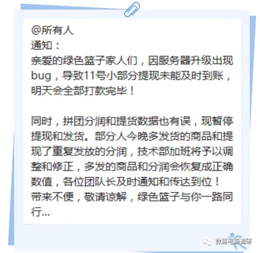 (图片来源网络) 调查还发现,在项目起盘的这一个多月的时间里,相继有用户表示,现金提现请求存在被驳回的可能。财神玩盘更是对此发声质疑:不发货不提现,绿色篮子到底怎么了?