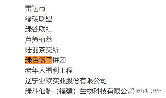(图片来源网络) 对于绿色篮子的本质,本平台也请来了行业专家对其进行分析,该专家认为:其本质还是打着拼团名义的项目,具有拉人头、多层次等特征。 如今,在由聚优传媒舆情监测中心与防传管家共同推出的投诉举报统计(统计来源于反传销网旗下各网络咨询平台及反传销网咨询部接到的关于对各类疑似资金盘,网络传销、非法直销、非法集资等情况登记)当中,绿色篮子拼团已然是榜上有名。
