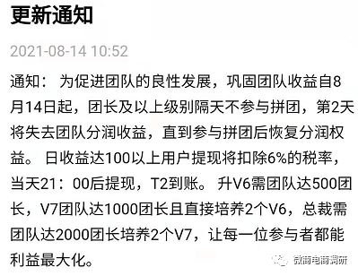(资料来源:奖金制度详解——定稿) 当时间来到8月14日,平台又接连发布了新的通知,对制度进行了一定程度上的调整,明确指出:团长及以上级别隔天不参与拼团,第二天将失去团队分润收益,直接参与拼团后恢复分润权益。