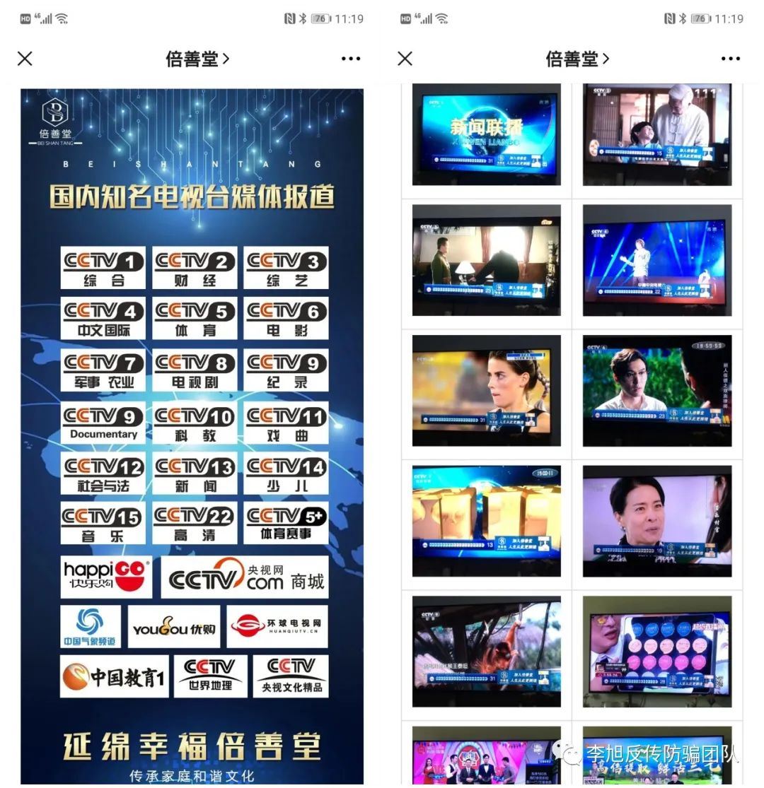 △截图来源:公众号倍善堂 这图片也是让朽无话可说,从没有在央视看到过这样的广告宣传,其大小、出现样式都是一样的。我们猜测,这图片不是自己P图,就是他们找的地方上的传媒公司合作,在一些地方的电视上出现,反正跟央视肯定是没有半毛钱关系。 接下来,我们再来看看倍善堂的代理模式。 据上述网友透露,倍善堂将代理分为四个级别,从高到底分别为总代、省级代理、市级代理及区代理。除此之外还有合伙人和高级合伙人 区代理:2980元,拿产品九四折,二次购货六三折(不管是直接销售还是通过二维码在商城上销售的都按六三折的差价秒到);直接批发10个区代晋升市代。 市级代理:19800元,拿产品九二折,二次购货五九折,销售差价按五九折算秒到;直接批发6个市代晋升省代。 省级代理:60000元,拿产品八四折,二次购货五三折,销售差价五三折秒到;直接批发5个省代晋升总代。 总代:300000元,拿产品六九折,二次购货四五折,销售差价四五折秒到。 区代直接批发一个区代拿982元秒到。 市代直接批发一个区代拿1109元秒到,批发一个市代拿7102元秒到,批发一个省代拿17857元秒到。 省代直接批发一个区代拿1299元秒到,批发一个市代拿8393元秒到,批发一个省代拿22142元秒到,批发一个总代拿69565元秒到。 总代直接批发一个区代拿1553元秒到,批发一个市代拿10115元秒到,批发一个省代拿27857元秒到,批发一个总代拿104342元秒到。 区代以上还有月度分红和全国每月业绩5%的分红(市代以上)。 自己成为总代,然后直推两个总代,旗下有10个总代,可以成为合伙人,合伙人享受全国销售额2%的季度分红。 自己成为总代,然后直推5个总代,旗下有30个总代,可以成为高级合伙人。高级合伙人享受全球净销售额1.5%的季度分红。 李旭表示,此模式极易将产品变成道具,演变成为以拉人头做代理为主的传销模式。 李旭反传销团队在网上也看到有网友吐槽 他们推销产品太恐怖了,而且那个凝胶备案的消字号,外用消毒用,产品夸大效果太多了,很假。 更有网友直呼骗子就是传销,拉人头 争议背后,倍善堂究竟会不会有改进措施,李旭反传销团队将持续关注。 本文系李旭反传销团队原创稿件未经允许请勿转载转载请注明来源 |
