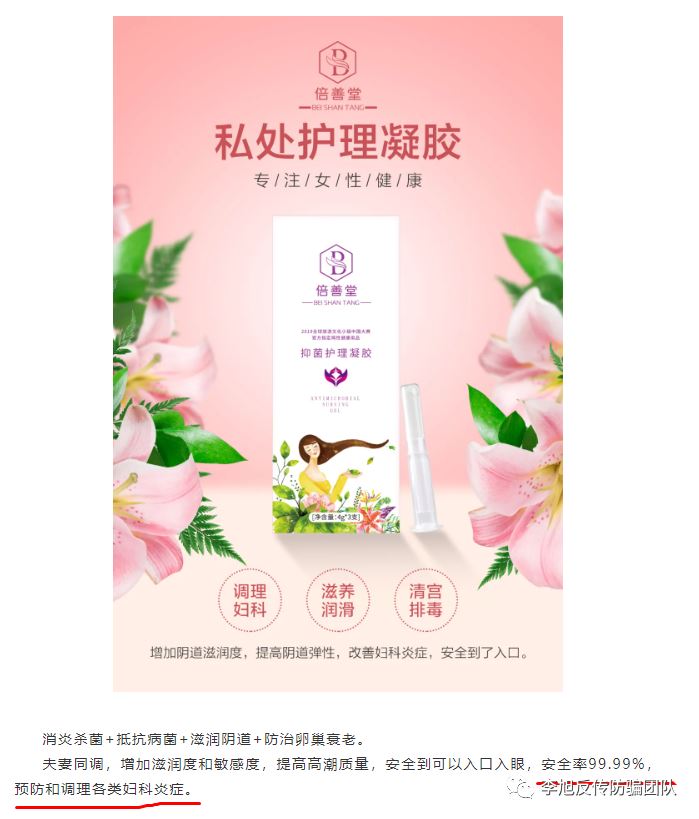 △截图来源:公众号倍善堂 该凝胶可以抗菌、抗簿、延缓衰老、调节免疫、调节内分泌,患有各类非传染性阴道炎、宫颈炎、宫体炎、盆腔炎的妇女;患有宫颈糜烂、阴道异味、外阴瘙痒等疾患的妇女;患有各类生殖系统感染性疾病,经临床常规治疗久治不愈的女性都适用该凝胶。 然而李旭反传销团队了解到,该款抑菌护理凝胶其实只不过是消字号备案,其卫生许可证号为粤卫消证字(2018)-01-第8018号,生产厂家为广州赛美药业有限公司。而消毒产品作为一种外用消毒杀菌产品,是不具备调节人体生理机能的功效,与药品有着明显的区别,是不能出现或暗示治疗效果的。