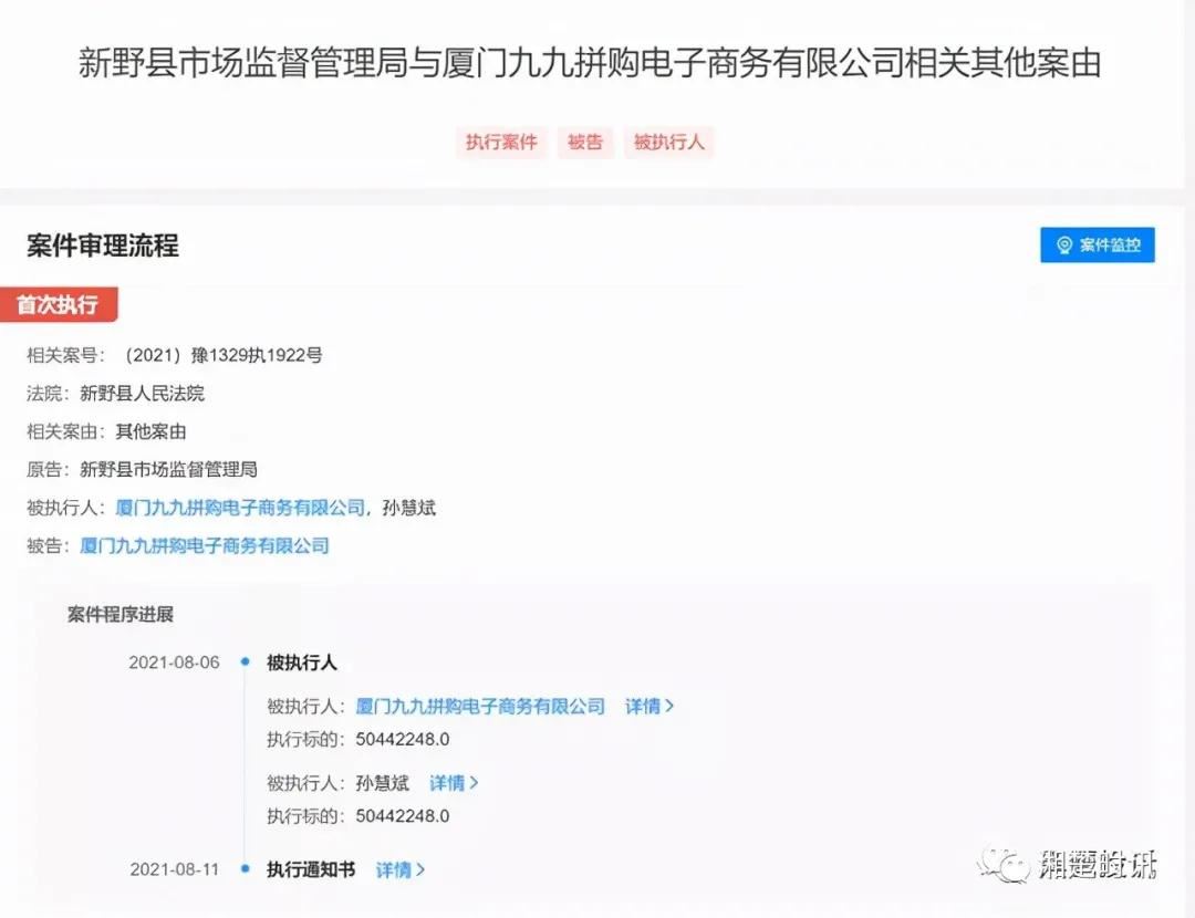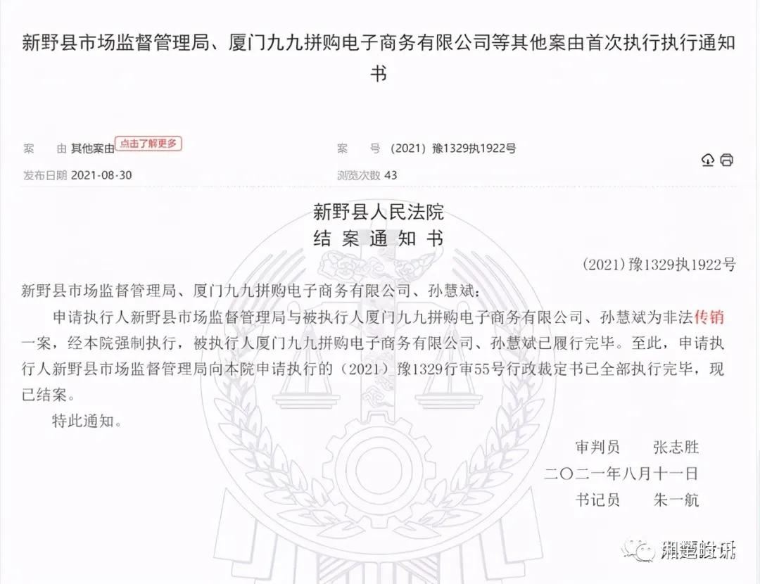 8月30日,中国裁判文书网公布一则题为新野县市场监督管理局、厦门九九拼购电子商务有限公司等其他案由首次执行执行通知书(简称:执行通知书)。 据执行通知书显示,申请执行人新野县市场监督管理局与被执行人厦门九九拼购电子商务有限公司、孙慧斌为非法传销一案,经本院强制执行,被执行人厦门九九拼购电子商务有限公司、孙慧斌已履行完毕。至此,申请执行人新野县市场监督管理局向本院申请执行的(2021)豫1329行审55号行政裁定书已全部执行完毕,现已结案。