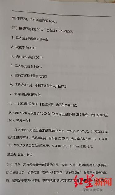 经销商合同的部分内容。 郗女士签署的经销商合同显示,她作为需方(乙方),需缴纳19800元的费用,即可获得该项目产品的经销授权,同时包括甲方提供的洗衣液全自动售卖机一台、洗衣液2000斤、洗衣液包装桶200个、洗衣液充值卡100张、营销方案和运营模式支持、活动培训支持、物料等相关材料支持、一个区域独家代理,以及价值4980元旅游卡1000张等服务。 在该合同的第二条供货价格处,明确写着,上述9个优势服务一共投资19800元。2场活动本钱就能回来得差不多,后期每购买一台机器2500元。洗衣液成本8毛一斤,厂家供应,加在洗衣液全自动售卖机里,卖3元一斤,有2倍左右的利润。 此外,该合同还显示,甲方所具有的责任有:根据区域情况委派市场营销人员,提供市场指导、终端产品销售培训、售后服务培训等支持;根据乙方在销售区域终端销量情况给予推广活动策划执行支持;对于区域大型销售渠道和行业客户,可协助乙方进行谈判和渠道拓展。 设备多次出问题 此前承诺一直无法实现 回到衡水后,郗女士大约等了一个星期左右,她收到了一台发自天津的洗衣液全自动售卖机,以及发自石家庄的2000斤桶装洗衣液。