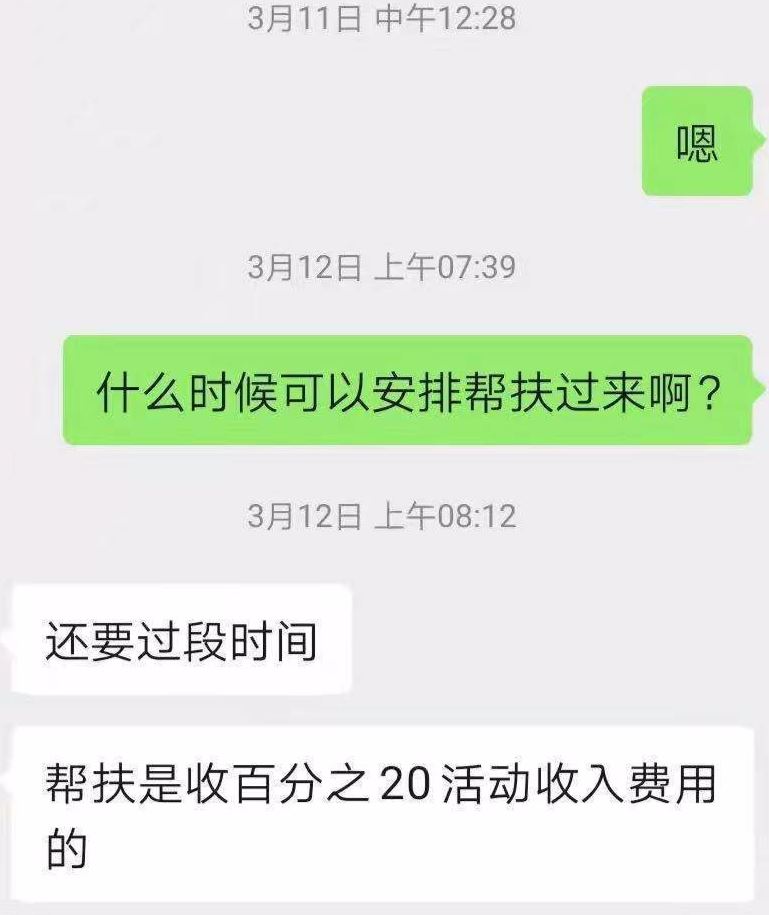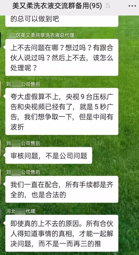 合伙人称,此前甲方曾表示帮扶免费,现在却要收荣分之二十的费用。 刘某也告诉记者,他的设备同样多次出现问题,不仅在运输时将设备的底座一角撞坏,导致无法平衡摆放,后来在使用时,还经常出现投币后不出液体等情况。除了这些外,我还多次向甲方申请让他们团队的人过来进行帮扶。刘某说,对方一直让他进行登记,排队等候,但等了近半年仍无后续。此外,此前甲方曾表示帮扶是免费的,现在却要收荣分之二十的费用,还表示全国各地帮扶不现实。 在一个名为美又柔洗衣液交流群备用的微信群中,红星新闻记者看到,有合伙人曾询问,为何此前提及的央视展播一直没有实现,以及说好的团队帮扶也没有进行。一备注名为刘某某公司售后的用户则回应称,他们一直在配合,所有的手续都是齐全的,也是合法的,审核问题,不是公司问题。此外,备注名为刘冠宇的用户也在群里表示,为了辅助各位合伙人把生意做好,央视5秒广告一直在努力申请,但因一个合伙人在百度上发了相关视频,导致整个审核停止。