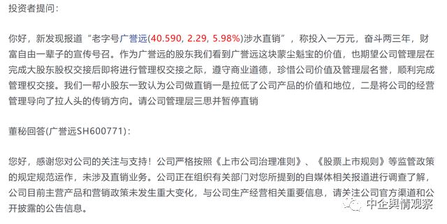 此外,还有投资者提问,你好,新发现报道老字号广誉远(40.590, 2.29, 5.98%)涉水直销,称投入一万元,奋斗两三年,财富自由一辈子的宣传号召。作为广誉远的股东我们看到广誉远这块蒙尘魁宝的价值,也期望公司管理层在完成大股东股权交接后即将进行管理权交接之际,遵守商业道德,珍惜公司价值及管理层名誉,顺利完成管理权交接。我们一帮小股东一致认为公司做直销一是拉低了公司产品的价值和地位,二是将公司的经营管理导向了拉人头的传销方向。请公司管理层三思并暂停直销。 董秘回答(广誉远SH600771):您好,感谢您对公司的关注与支持!公司严格按照上市公司治理准则、股票上市规则等监管政策的规定规范运作,未涉及直销业务。公司正在组织有关部门对您所提到的自媒体相关报道进行调查了解,公司目前主营产品和营销政策未发生重大变化,与公司生产经营相关重要信息,请关注公司官方渠道和公开披露的公告信息。 老字号广誉远之所以有这么多投资人关心,是因为不久前有一家名为微商电商调研的自媒体发表一则题为老字号广誉远起盘直销:投1万元,可年入9986万?一文所致。 文中提到,据代理商王先生介绍,广誉远新零售起盘于2020年12月,真正开始运作市场是在今年2月,负责人是广誉远集团董事长张斌,据代理介绍,张斌与广誉远集团老板郭家学是亲兄弟,目前只有一个系统,就是宋强领导的誉德系统,据称宋强是直销老人,早年曾做过安利。 目前广誉远的经销商绝大多数都有过直销经历,而通过了解其奖金制度之后发现,广誉远新零售,更像是一个直销盘。 此外,报道中还显示广誉远新零售发布了合伙人共享计划,该计划分为三个板块,分别是社交新零售、共享商城和国医馆。值得注意的是,要加盟广誉远事业,必须从新零售开始做,当体系达到了一定的规模和流量之后,再开始运作共享商城,通过共享商城丰富产品类,最终打通遍布全国的国医馆。据悉,运作新零售,就要成为广誉远公司的销售代表,销售代表有三个等级,初级代理需要购货1800元,中级代理需要购货5400元,高级代理需要购货10800元。 而据广誉远内部资料显示,除了有三个等级之外,还包括推荐奖、拓展奖、管理奖、分享奖、福利奖及股份分红以及重销奖。