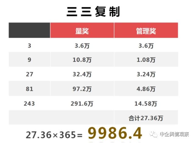 而如何实现年入9986万呢?据李先生介绍的三三复制表示,比如自己先发展三个下线,这三个人每人再发展三个下线,以此类推,发展到第五层,就有243个人,这样每天对碰奖(也叫量碰奖)、和管理奖共计可以拿到27.36万,一年下来可以拿到9986.4万元。 |