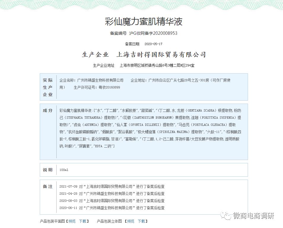 彩仙魔力蜜极华液外包装 代理商吴女士介绍,彩仙膜巢的主打产品彩仙魔力蜜极华液是一款医美级的基因细胞能量因子美容营养类产品。它不同于普通的化妆品以护肤为主,而彩仙可以起到解决皮肤问题的作用,以及修复和改善细胞。 普通护肤品一般只能作用在皮肤表层,起到保养皮肤的作用,而彩仙原理就是让玻尿酸、胶原蛋白等维持皮肤活性的营养,通过皮肤层进入组织细胞,唤醒并修复日渐衰老的细胞机能,从而使面部剪水嫩润泽,光滑透亮,具有深层补水、美白、淡斑、去皱四大核心功能,大品牌化妆品护肤品未能解决的问题,彩仙都能给解决了。 更神奇的是,据说这款产品还是微整型原液,里面添加了卤虫提取物,不用打针,不用开刀,不用填充,能够直接瘦脸。这款化妆品真的有这么神奇吗? 微商电商调研登陆了国家药品监督管理局官网,在国产非特殊用途化妆品备案信息查询发现,彩仙魔力蜜极华液的实际生产企业为广州市锦盛生物科技有限公司,该款产品的主要成分为:水、二醇、水解胶原、甜菜碱、龙胆根提取物、粉防己提取物、花椒果提取物、连翘提取物、卤虫提取物、仙人掌、提取物、马齿苋提取物、抗坏血酸磷酸酯钠、烟酰胺、聚谷氨酸、极大螺旋藻提取物、六肽-11、棕榈酰四肽-7、棕榈酰三肽-1、氢化卵磷脂、甘油、富勒烯、二醇、2-己二醇、芽孢杆菌/大豆发酵产物提取物、透明质酸钠、叶酸、尿囊素、EDTA二钠。