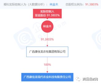 企查查显示,广西康佳龙现代农业科技有限责任公司成立于2011年10月10日,注册资金2000万元,实缴资本300万元。公司法人代表为林金木,也是公司最终受益人,通过直接或间接持股91.3803%。 2018年11月6日,该公司因不符合食品安全标准食品被南宁市武鸣区食品药品监督管理局处罚。 |