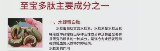 专利说明书摘要还提到30名患者服用药物组合物以后,疾病症状(脑供血不足、血液粘稠、胸闷气短、心绞痛、脑血栓等)消失或者明显改善。 在市场中,根据发明技术生产的产品叫至宝多肽地龙蛋白纳豆粉,但并非药物组合物,只是一款普通食品。据该产品的外包装,配料主要成分与发明专利配料主要成分明显不同,对此,至宝多肽经销商李某解释说公司已对配方进行了升级。 关于至宝多肽的配料,仁德康泰官方与市抄销商的说法各执一词,犹如一个罗生门。 官方公众号仁德康泰降管理在2020年5月18日发布的一条重要通知提到:因水蛭素、蚯蚓酶属于药物,不属于食品范畴,禁止经销商宣传至宝多肽含有水蛭、水蛭素、蚓激酶等。 然而,市场中,至宝多肽销售人员宣称得最多的就是至宝多肽有发明专利,药食同源,含有水蛭、蚯蚓、纳豆等提取物。 至宝多肽经销商张某称,至宝多肽至少有9大功效: