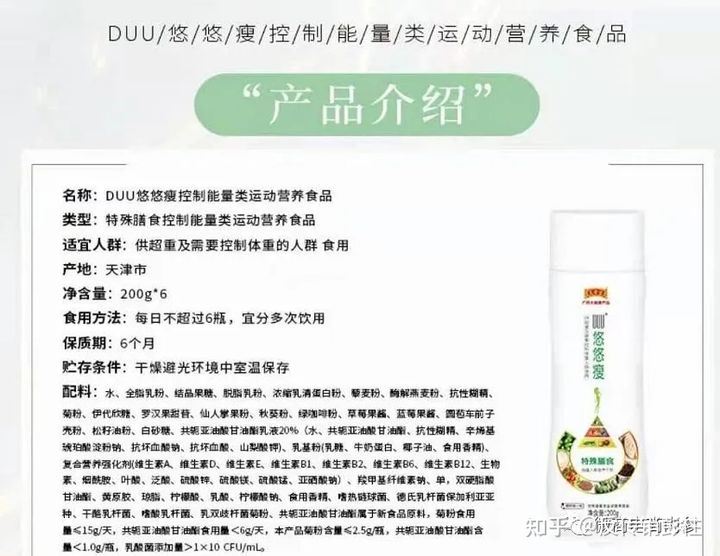 减肥功效,宣传靠谱? 关于产品,类型为特殊膳食控制能量类运动营养食品的DUU悠悠瘦控制能量类运动营养食品为悠悠瘦项目运营方所推向市场的核心产品。