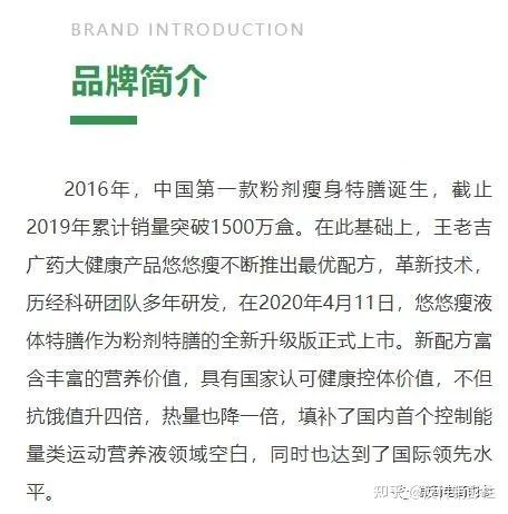 关于悠悠瘦的品牌背景,据悠悠瘦网站介绍,2016年,中国第一款粉剂瘦身特膳诞生,截止2019年累计销量突破1500万盒。在此基础上,王老吉广药大降产品悠悠瘦不断推出最优配方,革新技术,历经科研团队多年研发,在2020年4月11日,悠悠瘦液体特膳作为粉剂特膳的全新升级版正式上市。新配方富含丰富的营养价值,具有国家认可降控体价值,不但抗饿值升四倍,热量也降一倍,填补了国内首个控制能量类运动营养液领域空白,同时也达到了国际领先水平。