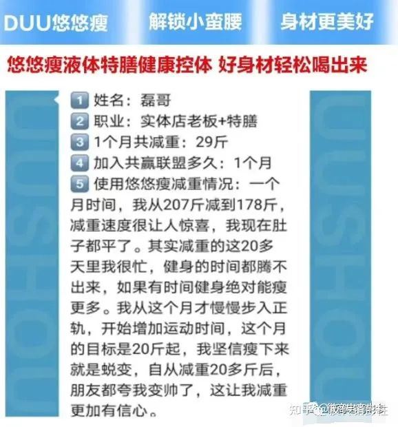 而在经销商于线上开展的宣传攻势下,一些所谓的减肥成功案例也相继跳进了大众的目光所及之处,并引来了无数参与者为之代言。