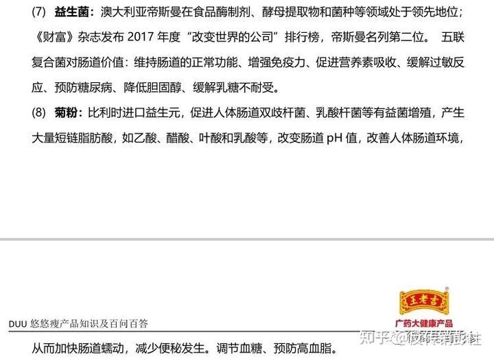 (图片来源网络) 当非保健食品广告宣传保健功能时,可依据广告法第九条第(十一)项的规定以及食品安全法实施条例规定禁止的情形对其定性。食品广告宣传保健功能,是对其性能和功能的一种描述。广告法第二十八条第二款第(二)项规定,商品的性能、功能与实际情况不符,对购买行为有实质性影响的,可以认定为虚假广告。非保健食品广告宣传保健功能,是对食品本身性能和功能的虚假描述,容易引起消费者的误解,可以虚假广告对其定性。 此外,悠悠瘦百问百答等资料还存在通过宣传该产品成分的功效,进而暗示产品本身具有其他功效的行为。比如益生菌成分,就被介绍为具有增强免疫力,预防糖尿病,降低胆固醇等功能;再比如菊粉,就被介绍为具有减少便秘发生,调节血糖、预防高血脂的效用。