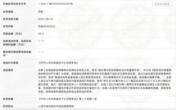 近日,养乐多关联公司上海益力多乳品有限公司新增一则行政处罚,处罚事由为宣传益生菌在新冠簿防治中有重要作用等,极易使消费者误解。被上海市浦东新区市场监督管理局处以45万元罚款。