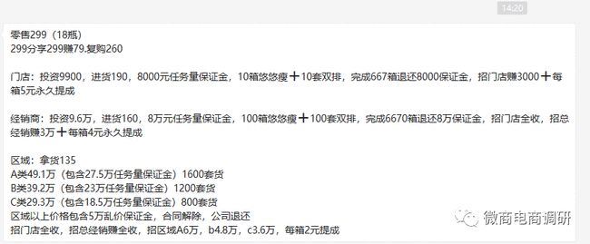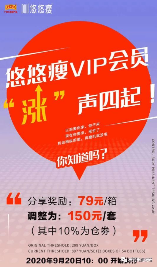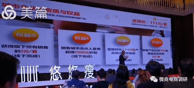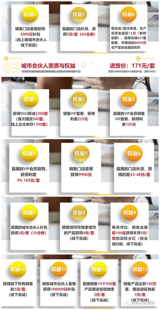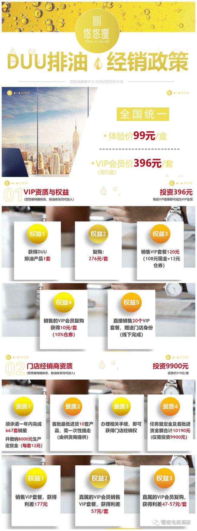 我们了解到了悠悠瘦的公司背景,以及围绕着相关产品出现的宣传问题,在本篇报道中,我们将着重关注的是悠悠瘦的奖金制度。 制度现状,如何解读 2020年10月22日,公众号悠悠瘦排油咀嚼片代理发布文章悠悠瘦排油咀嚼片价格及代理政策解析对相关的奖金制度进行了分析: ![]() 一、悠悠瘦排油片零售价格一盒99元,一盒12粒装。 二、团购体验价5盒396元(在内招期活动中,会员299元可以获得5盒产品),拿奶昔的话是3提(1箱)396元。 三、VIP价格15盒897元,成为VIP 权益: 1、推荐一个VIP挣150元,推荐的VIP复购5盒得10元奖励 2、再次下单299元享受复购价260元 3、VIP推荐10个直属VIP,或者推荐20个299元客户,可直接升级门店经销商,享受门店经销商拿货价格 四、悠悠瘦排油门店代理9900元,8000元生产定金+1900元货(拿货价5盒219元),生产定金8000元可退,每补货5盒返12元,直至8000元全部返还 悠悠瘦排油门店代理的权益: 1、零售利润差,比如销售5盒299元,挣80元 2、推荐奖励,推荐一位门店代理得3000元,推荐的门店补货得5元/5盒 五、悠悠瘦排油城市合伙人9.8万(拿货2500盒),全国限量招募 悠悠瘦排油城市合伙人权益: 1、销售利润差价 2、推荐奖励,推荐一位9.8万合伙人奖励2.5万,补货奖励4元/5盒 3、选择的所在城市,比如南京,那么南京收货的订单将获得过路费4元/5盒的奖励 事实上,在这个经历过涨价时期的奖金制度推出之前,还有一个更早期的版本。不同版本之间的变化体现在以下几个方面: ![]() ![]() ![]() 目前,消费者购买悠悠瘦奶昔,还能拿到双排组合,即潮瘦排油糖和纤能量排油糖。按照代理商阿庆(化名)的说法,无论是代理奶昔还是压片糖果,都可以按照同一套制度走,产品可以混拿,但买压片糖果不会得到赠送的双排组合。 ![]() 值得一提的是,还有悠悠瘦的代理商在个人公众号上承诺道:应用这套组合的消费者,如果瘦不下来,赔两万。 ![]() 这种说法也很容易让人联想起来陈光标和由他代言的在2016年就已推向市场的天杞园特殊膳食。 ![]() 有意思的是,比食品更有效,比药品更安全,比保健品更科学的说法可能也是最先出自天杞园的宣传广告。天杞园的珠玉在前,反而令如今的悠悠瘦显得有些照猫画虎的意思,两者都是供超重人群食用的特殊膳食,都是宣传具有减肥功效,还都做出了保证与承诺。 ![]() 但天杞园膳食宣传能减肥的广告手法,则早被药品价格315网辟谣: ![]() 至于悠悠瘦现行的推广政策,调查发现该版本的制度图和上述制度讲解又变得有所出入了,最新的DUU排油经销商政策显示如下: ![]() ![]() 在前段时间举行的排油王新品发布会中,还有讲师在现吃相关制度进行了解读,足见上述制度图片的真实性。 ![]() ![]() (限于篇幅,截取部分图片) 现场促销政策: ![]() 活动现场的福利炸弹: ![]() 顺带一提,此前在合伙人之上还有一个级别,叫区域。 ![]() 虽然目前公司已经不招收区域这个级别了,不过此前成为区域代理的后台还依然保留。据知情人透露,区域拥有的权限包括激活合伙人和门店,而如今合伙人要想激活门店,还需要通过公司办理。 媒体报道,有所提及 数个月前,南方都市报曾在报道中提到过悠悠瘦。 ![]() 报道称,2020年8月,上海禁毒办通报,所谓的泰国减肥药多含有我国列管的精神药品,也就是说,这些减肥药在我国属于含有毒品。在上海,这类减肥药涉毒案件居然占到整个上海今年到目前涉毒品类案件的85%,引发了社会关注……几个月前,曾经向陈晨(化名)大力推荐DC减肥药的人停止了这款药的代购,转而开通了另一个昵称为陈蕾宇8号的微信号,开始做一款名为悠悠瘦的营养特膳售卖,并在朋友圈大力宣传代理业务,甚至开始组织线下创业营和线上公开课。 ![]() 陈晨回忆说,她2014年买药时,对方还是个没什么影响力的微商,而现在已经是个小有名气的朋友圈网红了。不过此人现在当然是不敢再卖DC减肥药了。 后 记 对于近年来各种各样标榜自身神效的减肥食品,以及由这些产品引发的虚假宣传乱象,文章专家提示3类减肥保健品多为虚假产品曾指出,对于爱美又爱降的中青年女性来说,减肥是一个永恒的热门话题,但减肥同时还是一项复杂工程,要想真正实现减肥目的,理性态度和科学方法,二者不可缺一。信息日报也认为,减肥市尘没有过错,但任何减肥方式首先要改掉其掺水和吹嘘的毛病,与消费者坦诚相待;商家要诚信自律,把顾客安全摆在第一位,不要因为只顾眼前小利,而自毁招牌;监管部门要对市场上明目张胆的违规现象狠治,彻彻底底规范净化减肥市场。 ![]() 至于以让天下无胖子,人人都降为品牌使命、以为爱出发,把降传遍天下为品牌愿景的悠悠瘦在今后会如何发展 |