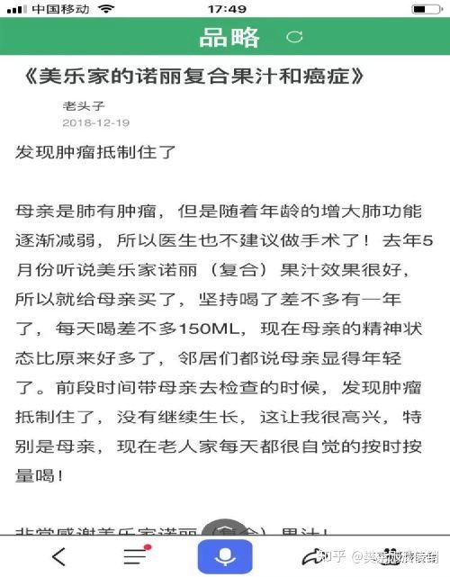 环保产品或普通产品能治病? 美乐家的产品共分为四大系列,第一大系列是家用清洁系列。第二大系列是营养辅助食品系列。第三大系列是水贝娜剪美容保养系列,第四大系列是优植生活身体保养系列。主打着环保降财富自由吸引人群。每个系列都有很多的热门单品,其中比较热门的一款单品诺丽复合果汁宣称具有治癌治糖尿病等的功效。以下是诺丽复合果汁治疗肿瘤的一个案例,一位女士介绍说自己的母亲患有肿瘤,喝了诺丽果汁一年肿瘤居然抵制住了。不过从网上搜索美乐家可以看到很多网友的投诉,美乐家的保健品不仅不能提高免疫力,孩子服用后出现了上吐下泄、腹部阵痛的情况。号称环保的洗衣液,泡沫很大,洗衣机清洗四五遍还是有泡沫。润肤水包装瓶有缺陷,不能随身带,平放会溢出等等。有网友还介绍说家乐美的保健品是没有通过国家检测的,所以干脆以食品的形式出售。实际包装因为没有保健品资质所以不敢写功效,功效基本都是会员鼓吹拉人的。