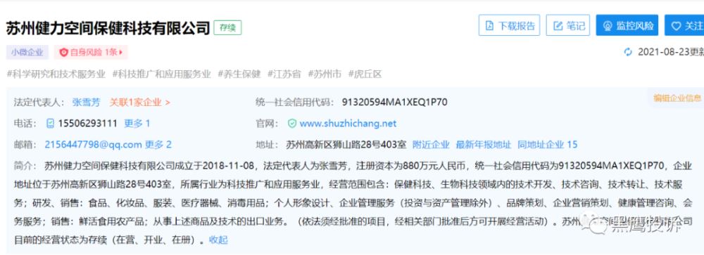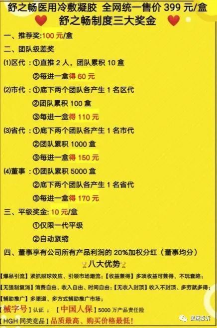 据企查查显示,苏州健力空间保狡技有限公司成立于2018年11月8日,注册资本为880万元人民币。法定代表人为张雪芳,同时也是公司的大股东及实际控制人。公司经营范围包含:保狡技、生物科技领域内的技术开发、技术咨询、技术转让、技术服务;研发、销售:食品、化妆品、服装、医疗器械、消毒用品。 公司旗下主要产品为舒之畅HGH冷敷凝胶系列。此前,舒之畅HGH冷敷凝胶此前就曾多次被媒体质疑虚假宣传与涉嫌传销。 据悉,购买HGH399元便可成为舒之畅会员,即可享受终身分享赚钱的权益。