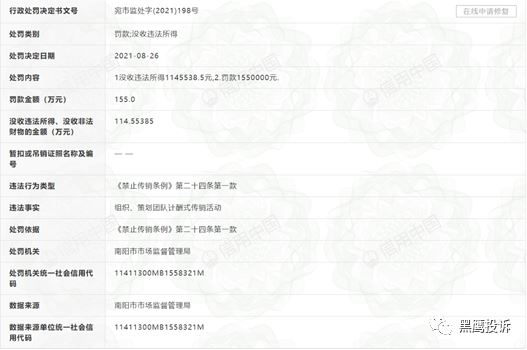 据悉,该处罚决定书文号为宛市监处字(2021)198号,处罚决定日期为2021年8月26日。依据禁止传销条例第二十四条第一款内容规定,责令没收违法所得1145538.5元,并处罚款1550000元,共计罚没269万余元。