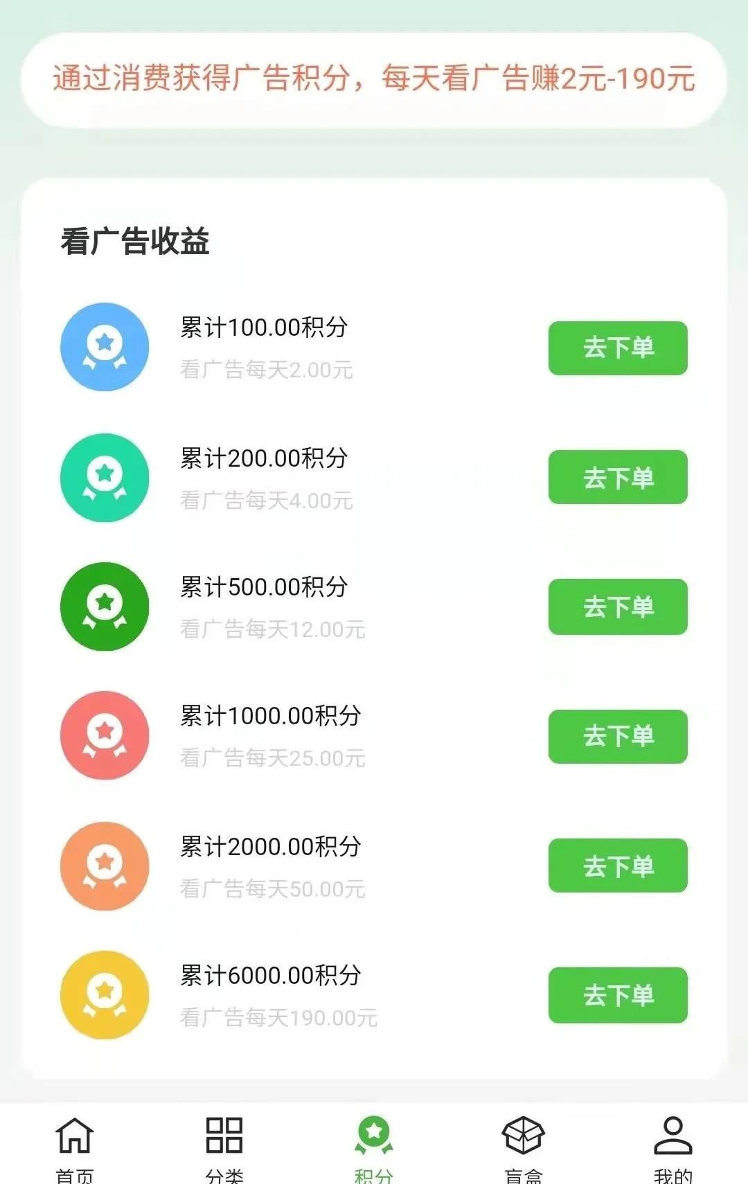 看广告收益 100积分 看广告最高2元 200积分 看广告最高4元 500积分 每天看广告最高12元 1000积分 每天看广告最高25元 2000积分每天看广告最高50元 6000积分 每天看广告最高190元 备注积分收益时间为365天!到期复投所有奖励应有尽有! 建团队收益 N1:拿直推收益 30%拿间推收益20% N2:(直推5个,团队15个人)拿伞下团队收益的8% N3:(直推10个,其中有5个N2) 拿整个团队收益15%,平级10% N4:(直推20个,其中有6个N3)拿整个团队收益的30%,平级20%