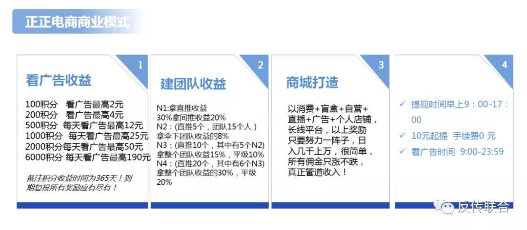 在正正广告商城还有一种开盲盒的玩法。分别为4个档次的盲盒,9.9元,100元,500元,1000元。盲盒抽中的物品也累计积分。 通过上文我们了解了正正广告商城的玩法和收益模式,现在我们就来说说它的模式到底属于什么。首先我们先来了解下什么是旁氏骗局,庞氏骗局又称拆东墙补西墙或空手套白狼。简言之就是利用新投资人的钱来向老投资者支付利息和短期回报,以制造赚钱的假象,进而骗取更多的投资。很多非法的传销集团就是用这一招聚敛钱财的。 了解了什么是旁氏骗局后,再来看看正正广告商城看广告的模式是否与庞氏骗局是否相符。打个比方,假如商城用户只有我一个人,我在正正商城有6000的积分,每天可以领取190元,一年可领取69000多,基本30天就可以把6000元回本。那么多赚的63000元从哪里而来?办法只有一个只有加入源源不断的新投资人,才能保持我拿完69000的收益。此模式与旁氏骗局完全相符。 N1:拿直推收益 30%拿间推收益20% N2:(直推5个,团队15个人)拿伞下团队收益的8% N3:(直推10个,其中有5个N2)拿整个团队收益15%,平级10% N4:(直推20个,其中有6个N3)拿整个团队收益的30%,平级20% 我们再来看看团队收益。在这里解释下,比如说我推荐了一个下线,我的下线有6000的积分每天可以领190元,只要她每天领取190元,我就有190元的30%=57元的收益。我的下线再发展一个人也有6000的积分也可以每天领190元,我也有190元的20%=38元的收益。说到这里就有必要讲讲禁止传销条例了。 下列行为,属于传销行为: (一)组织者或者经营者通过发展人员,要求被发展人员发展其他人员加入,对发展的人员以其直接或者间接滚动发展的人员数量为依据计算和给付报酬(包括物质奖励和其他经济利益,下同),牟惹法利益的; (二)组织者或者经营者通过发展人员,要求被发展人员交纳费用或者以认购商品等方式变相交纳费用,取得加入或者发展其他人员加入的资格,牟惹法利益的; (三)组织者或者经营者通过发展人员,要求被发展人员发展其他人员加入,形成上下线关系,并以下线的销售业绩为依据计算和给付上线报酬,牟惹法利益的。 再正正广告商城中还有一种模式,寄售模式。据了解在商城中购买物品后,如果不想要该物品的话,可以由平台寄售变现,购买物品的积分不会变,还是原来的积分。由于该模式需要购买商品才能出现寄售按钮,所以在这里不多阐述。