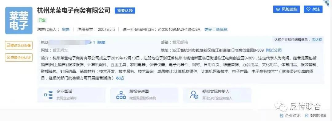 反传销联合会通过爱企查得知,杭州莱莹电子商务有限公司成立于2019年12月10日,注册地位于浙江省杭州市钱塘新区临江街道临江电商创业园9-309,法定代表人为高娟。注册资本200万元,实缴资本200万元。