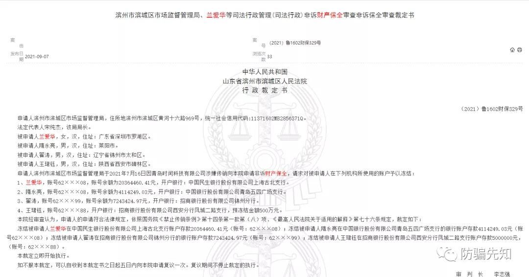 原文如下: 申请人滨州市滨城区市场监督管理局于2021年7月16日因青岛时闰科技有限公司涉嫌传销向本院申请非诉财产保全,请求对被申请人在下列机构所使用的账户予以冻结: 1、兰爱华,账号62×××08,账号余额为20364460.41元,开户银行:中国民生银行股份有限公司上海古北支行。 2、隋永亮,账号62×××08,账号余额为4114249.03元,开户银行:中国银行股份有限公司青岛五四广场支行。 3、翟涛,账号62×××99,账号余额为7243424.97元,开户银行:招商银行股份有限公司锦州分行。 4、王珺钰,账号62×××88,开户银行:招商银行股份有限公司西安分行凤城二路支行,预冻结金额500万元。 本院经审查认为,申请人的申请符合法律规定,依照国务院禁止传销条例第十四条第一款第(八)项、最高人民法院关于适用的解释第七十六条规定,裁定如下: 冻结被申请人兰爱华在中国民生银行股份有限公司上海古北支行账户存款20364460.41元(账号:62×××08);冻结被申请人隋永亮在中国银行股份有限公司青岛五四广场支行的银行账户存款4114249.03元(账号62×××08);冻结被申请人翟涛在招商银行股份有限公司锦州分行的银行账户存款7243424.97元(账号:62×××99);冻结被申请人王珺钰在招商银行股份有限公司西安分行凤城二路支行账户存款5000000元,(账号:62×××88)。 本裁定立即开始执行。(备注:案件金额共计 36,722,134.41 元) 如不服本裁定,可以自收到本裁定书之日起五日内向本院申请复议一次。复议期间不停止裁定的执行。 此前,本网曾发布文章香港时闰女巫面具运作模式涉嫌传销 ,文章说明了SEEGREEN(女巫面具)商标所有者为香港时闰集团(国际)贸易有限公司,据官方显示,该商标代表的产品名称为SEEGREEN如初少女焕颜原液肽组合,生产企业为西安时闰商贸有限公司。