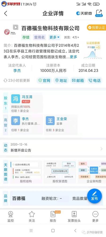 图片来源:天眼查 据天眼查显示,百德福生物科技有限公司成立于2014年4月23日,在2014年4月至2015年5月期间的曾用名是唐山市庆林肽生物工程技术有限公司,位于乐亭县城区工业聚集区,注册资本1亿,实缴1942.7万,法人代表李杰任执行董事、总经理,人员规模小于50人,参保人数40人,实控人冯玉清持股100%。 据官宣资料显示,百德福公司主要从事肽系列产品、植物和动物提取物、保健食品、医药原材料的研发、生产及技术服务,持续进行新技术与新产品的研发设计。所生产的兄子肽可用于营养食品、功能性食品、美容化妆品等领域。 普通食品、癌症克星? 尽管天眼查显示百德福公司的实控人是冯玉清,但在公司官网及宣传资料中均显示公司的董事长是冯卫,在其官网,还有一段冯卫与百德福的品牌故事: